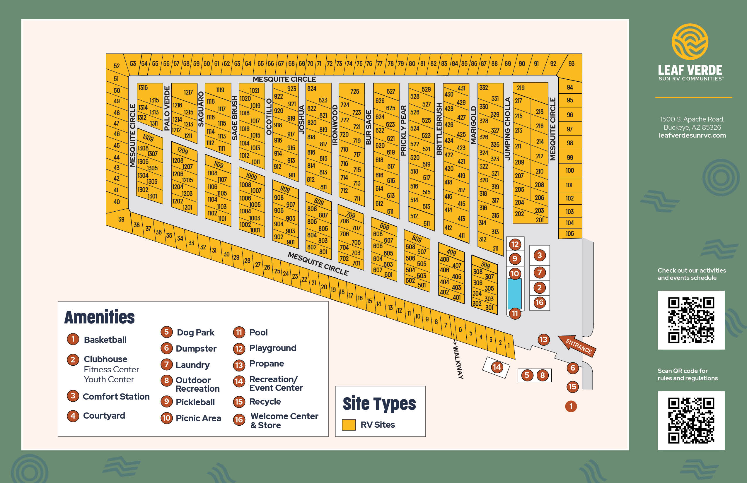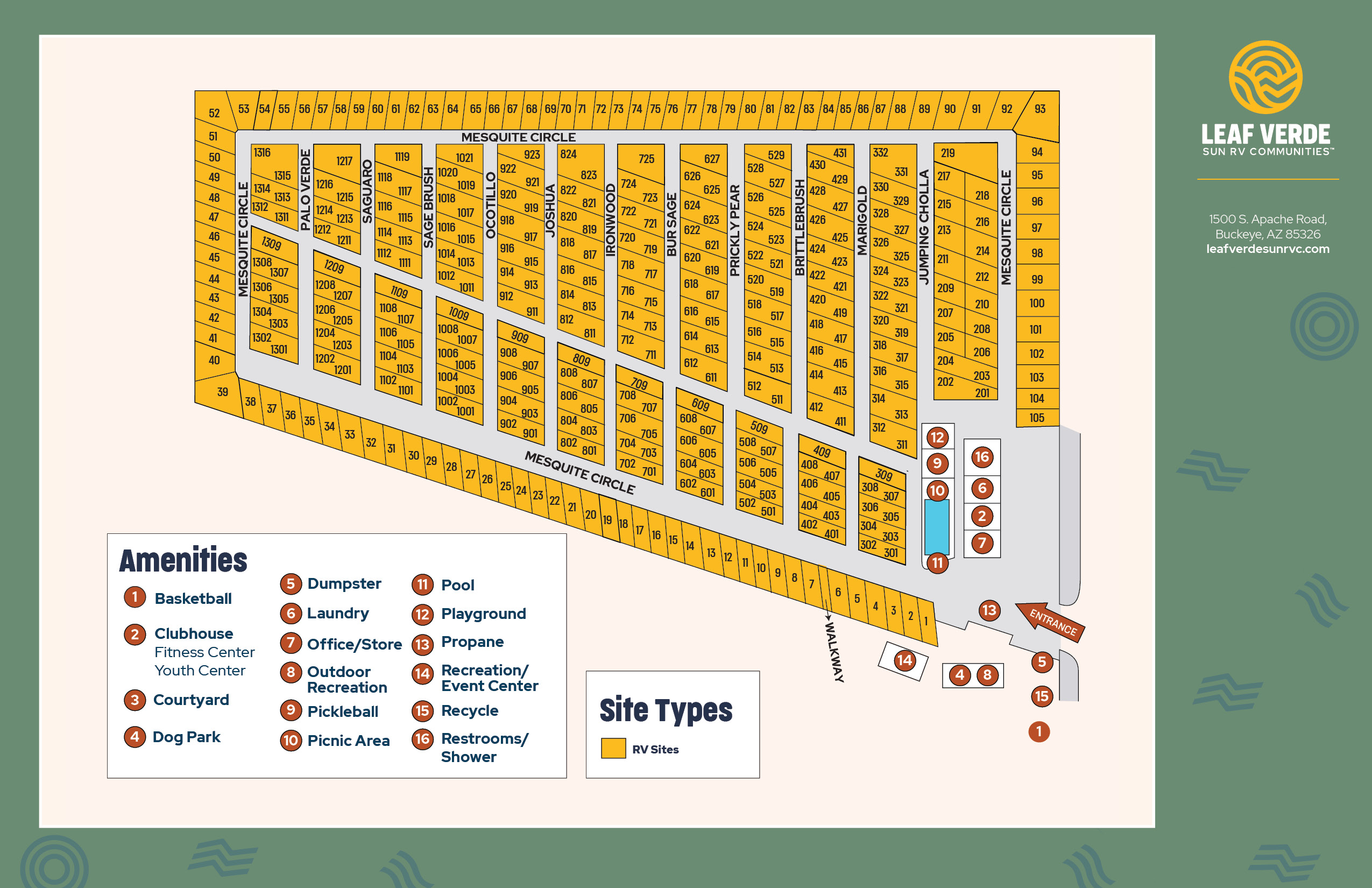 Surrounded by gorgeous desert landscapes, Leaf Verde RV Community features scenic RV sites in Buckeye, Arizona. Our community offers a wonderful RV living experience filled with family activities and entertainment. Enjoy a prime location near Phoenix attractions and explore the best of the local area.