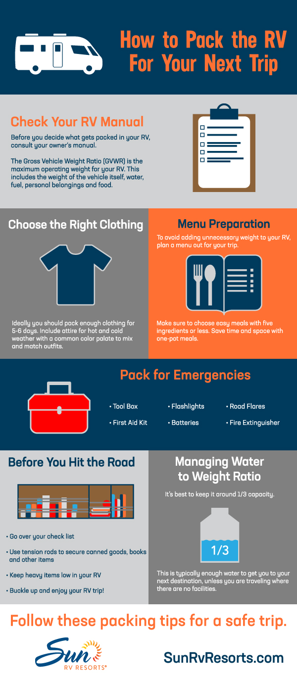 RVing offers a whole new level of convenience when it comes to camping. You get to enjoy more space, but more space means more decisions on what to pack for your next trip. For example, you'll need to consider things like planning for easy prep meals, what types of clothes to bring and how to stock your emergency first aid kit.