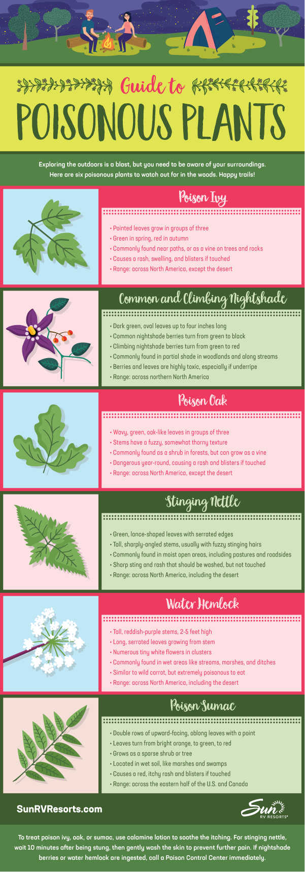 Hiking in the woods is a favorite camping activity for many. But if you're not careful, you could end up in trouble with poisonous plants! Some cause rashes and itching, while others can be deadly serious, requiring you to contact a Poison Control Center. To help you stay safe, we created an infographic guide to poisonous plants. Save it to your phone for use during your next walk in the woods!