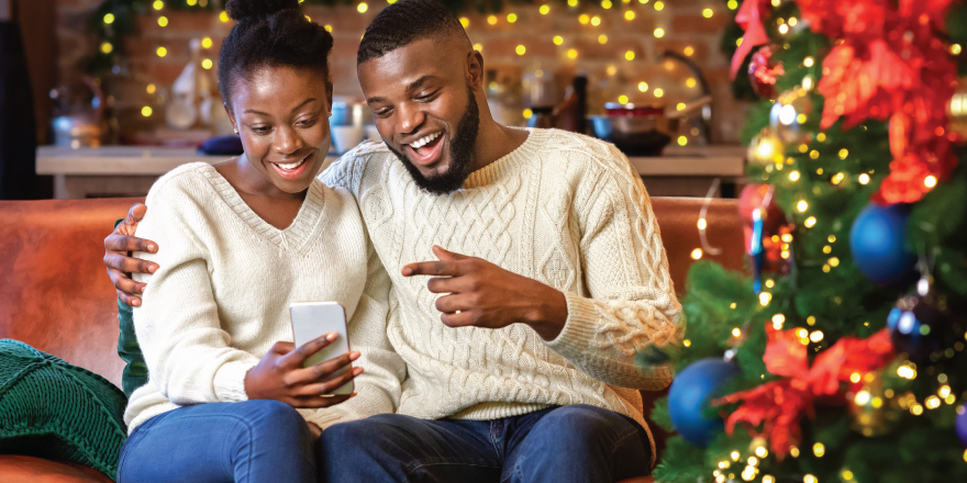 Couple sitting on couch looking at cellphone with Christmas tree behind