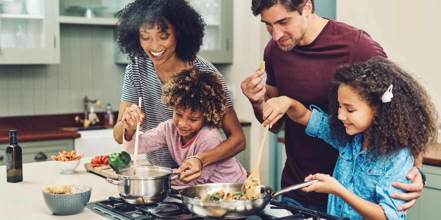 Family cooking together in kitchen. Kids are stirring pots on stove.