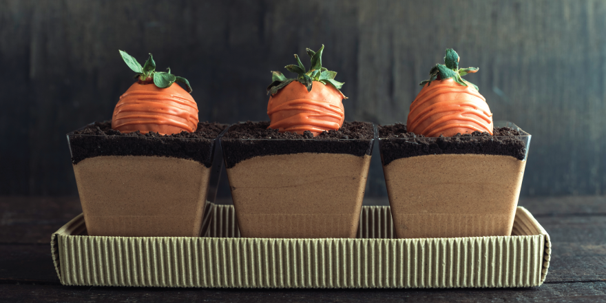 three dessert cups on table made to look like carrots sticking out of dirt for Easter
