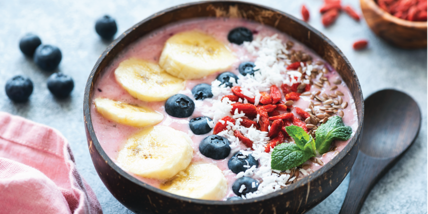 Acai bowl with bananas, blueberries, goji berries and mint
