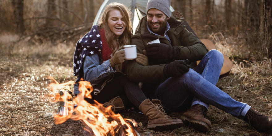 Man and woman holding coffee mugs near campfire