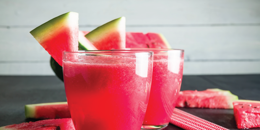 Watermelon slush in clear glass with watermelon wedge on the rim