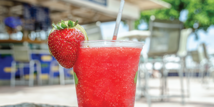 Frozen strawberry daiquiri in glass with strawberry on the rim and straw