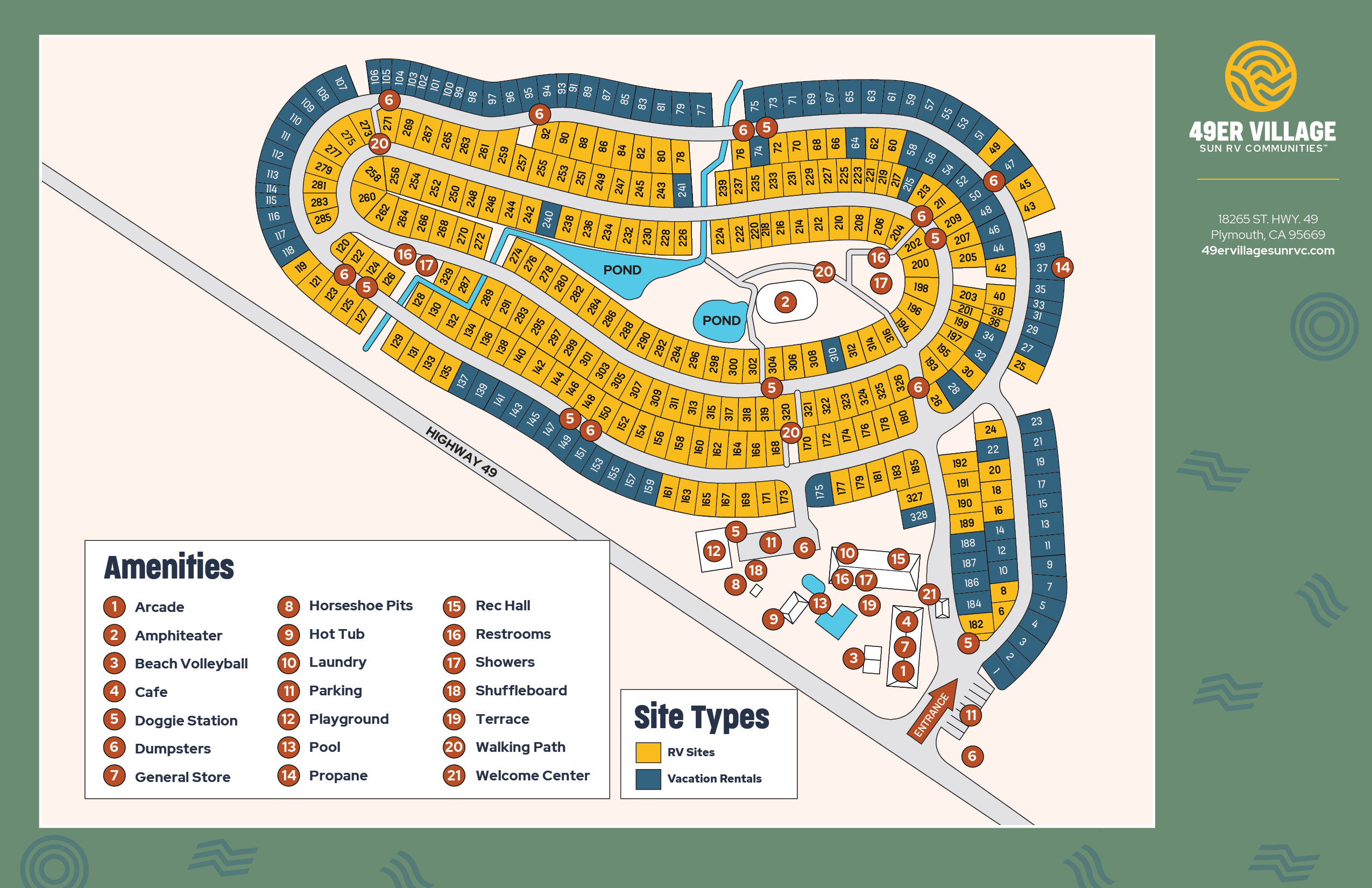 Nestled in the Sierra Foothills of Amador County, 49er Village RV Community provides the perfect RV community for you and your family. We offer a wide selection of accommodations with hundreds of full hookup sites and charming cabin rentals.