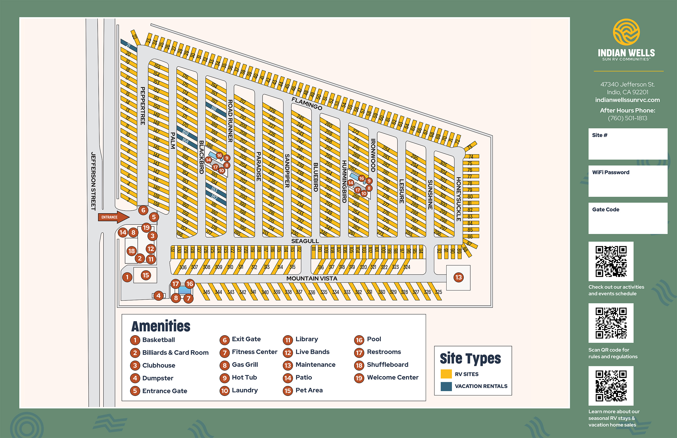 Wake up to an awe-inspiring view of the Santa Rosa Mountains when you choose Indian Wells RV Community in Indio, California. We have an amazing location in the Coachella Valley of Southern California's Colorado Desert, just 23 miles east of Palm Springs. Our RV community features more than 300 sites with full hookups, as well as a great selection of vacation rental homes.
