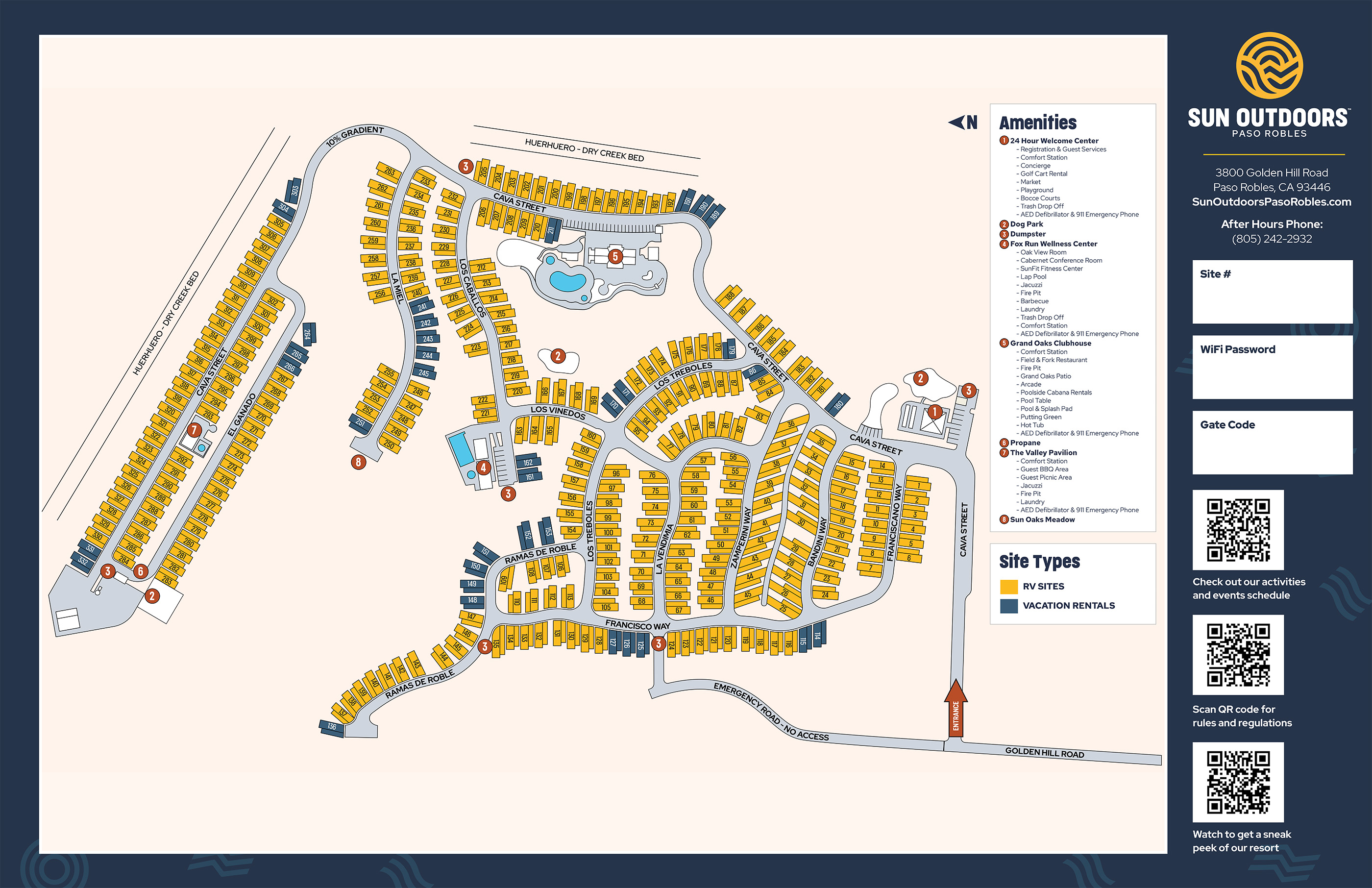 Elevate your RV experience to new heights by indulging in the luxurious amenities of Sun Outdoors Paso Robles. Formerly known as Cava Robles RV Resort, our resort is nestled in the breathtaking wine country of Paso Robles, offering awe-inspiring vistas and a serene natural environment. Whether you prefer to park your RV or stay in one of our lavishly furnished villas or cottages, you can immerse yourself in the tranquil beauty of our surroundings.