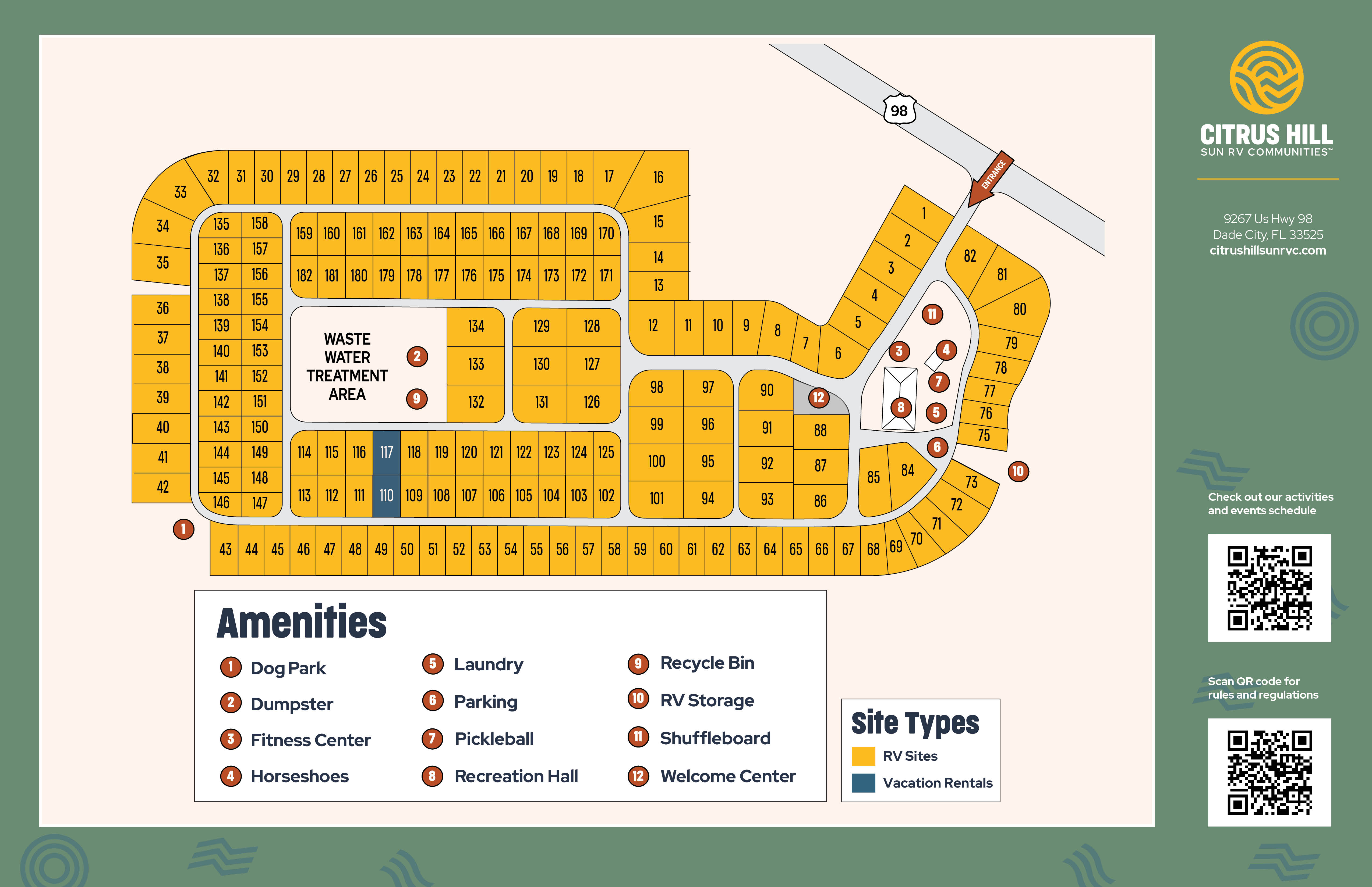 Nestled between orange groves in Central Florida's rolling countryside, Citrus Hill RV Community is just six miles from historic downtown Dade City and 35 miles from downtown Tampa. We provide over 180 full hookup RV sites that feature private picnic tables. Select sites also include concrete patios. You can also rent or purchase one of our gorgeous park model homes.