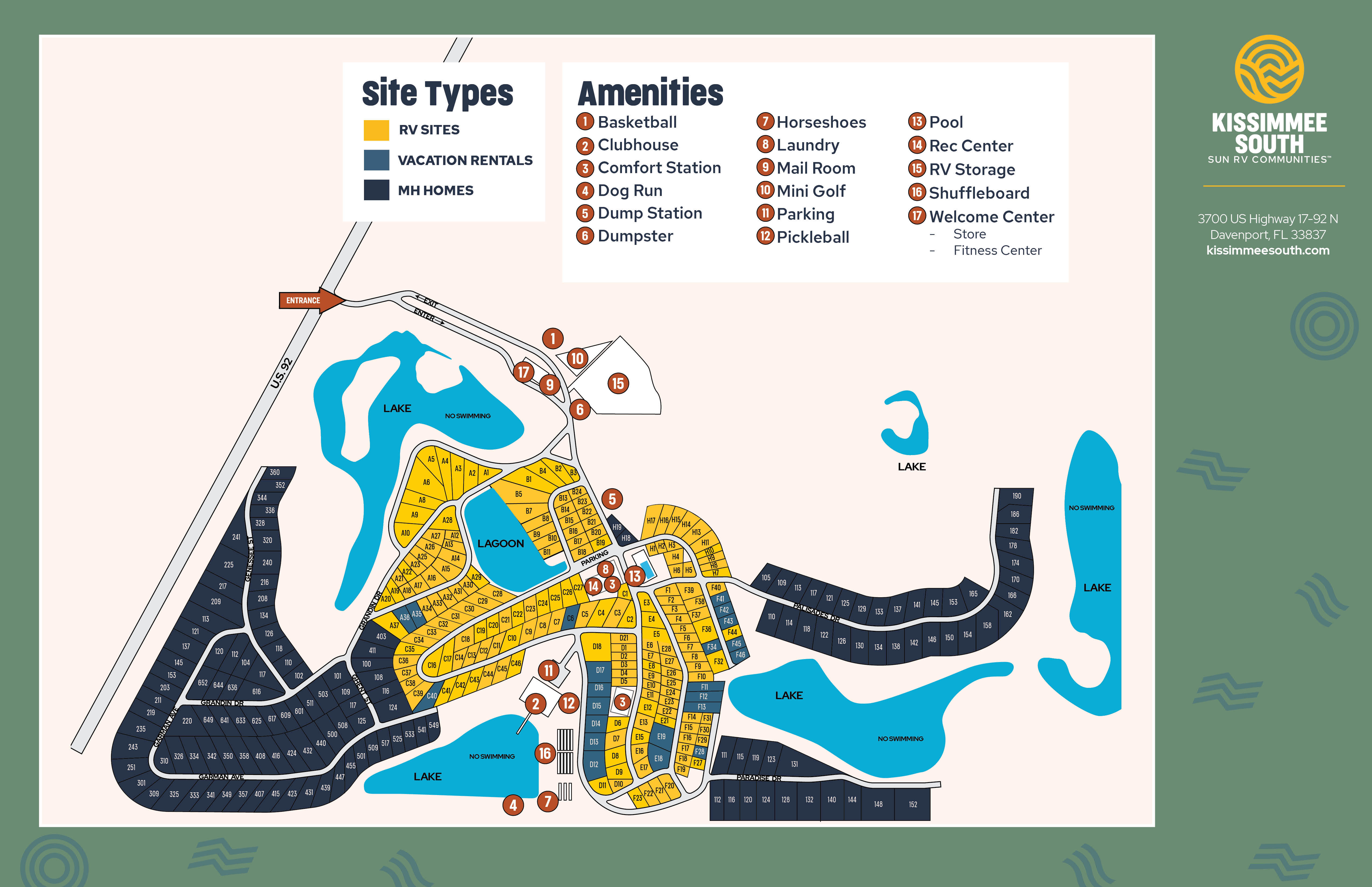 Enjoy small town charm near exciting Florida attractions like Disney World when you choose Kissimmee South RV Community. Our beautiful gated RV community caters to 55+ residents and is nestled in lush groves, offering a great selection of full hookup RV sites, as well as a variety of rental home options.