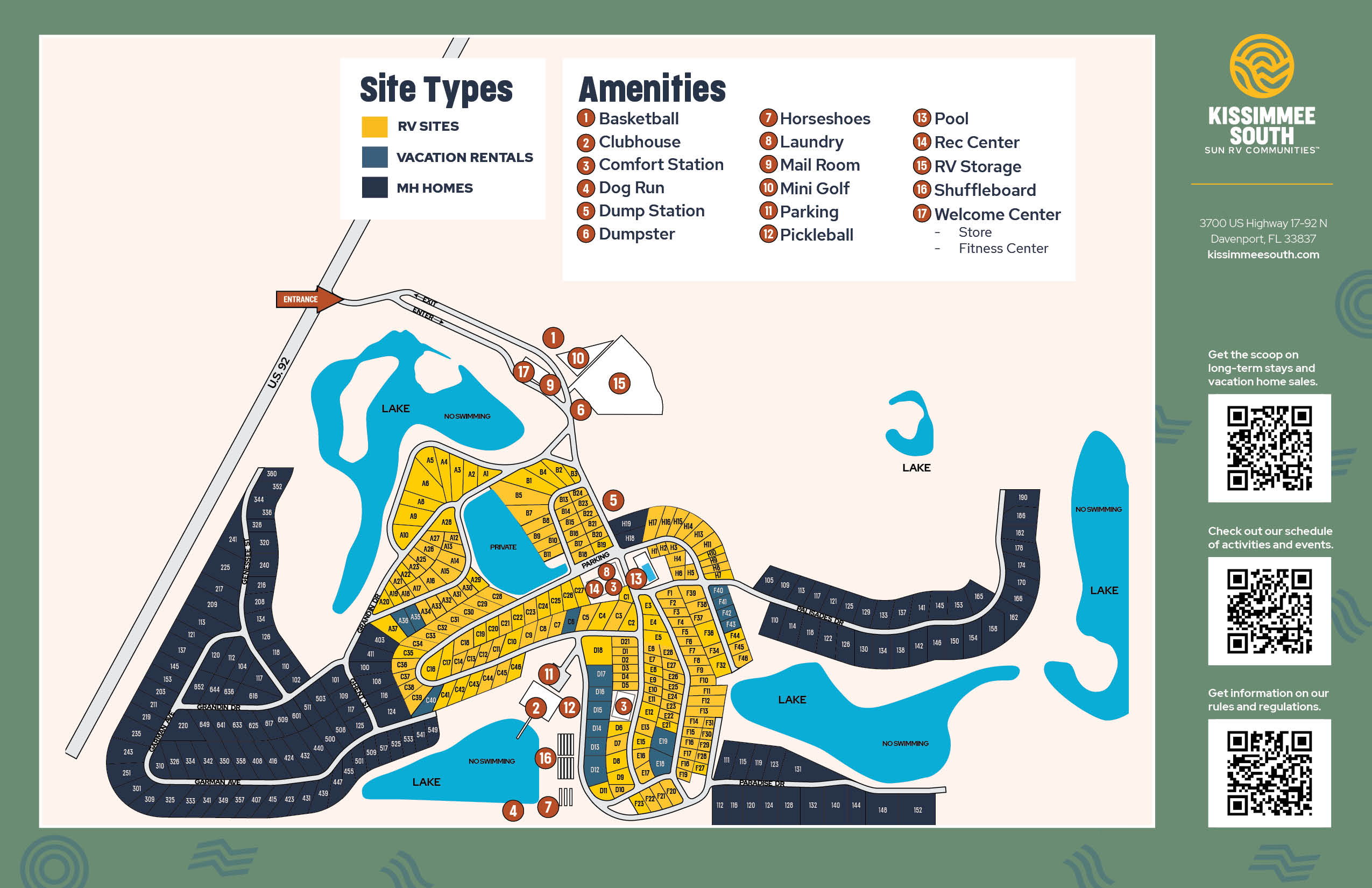 Enjoy small town charm near exciting Florida attractions like Disney World when you choose Kissimmee South RV Community. Our beautiful gated RV community caters to 55+ residents and is nestled in lush groves, offering a great selection of full hookup RV sites, as well as a variety of rental home options.