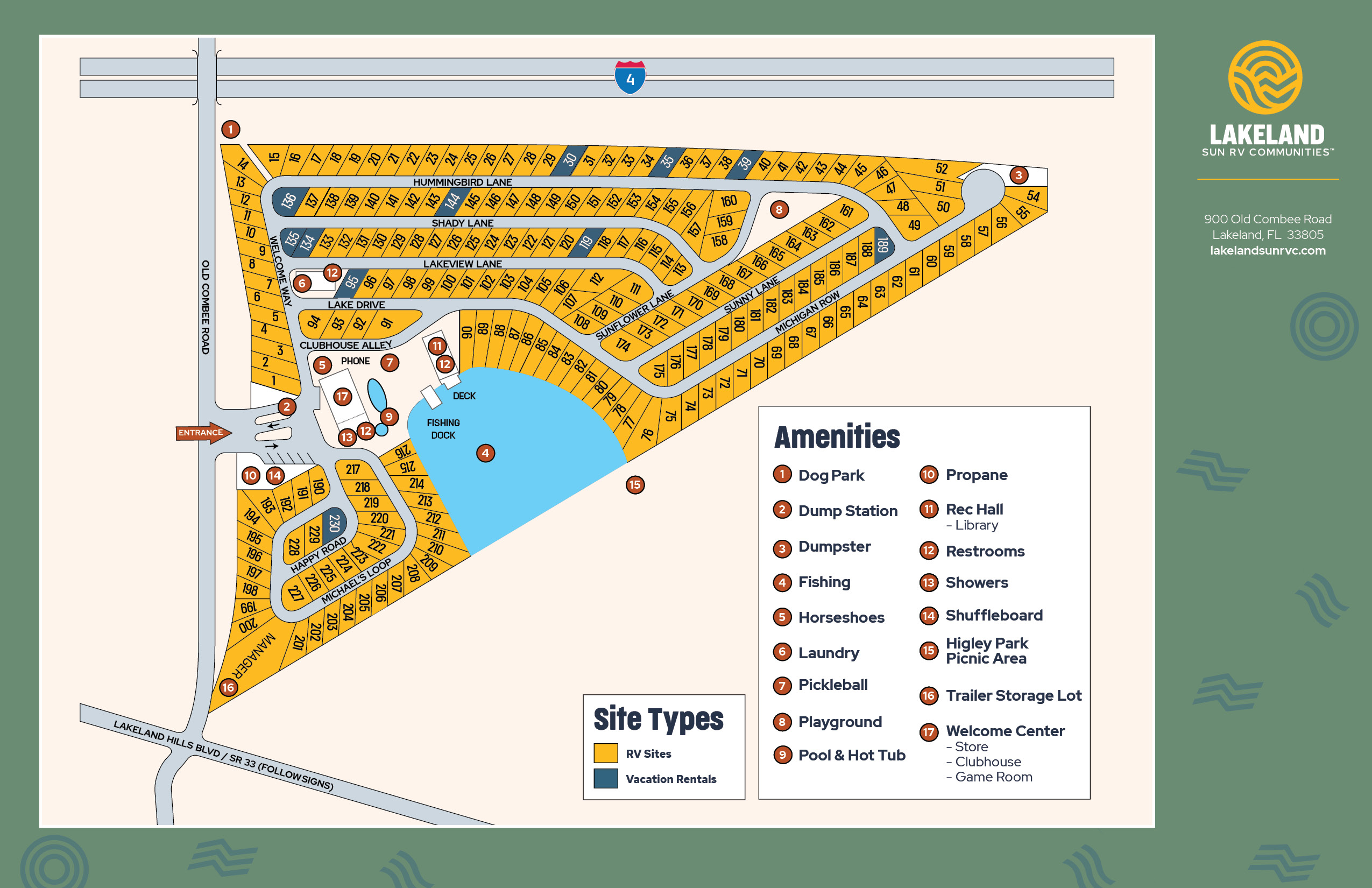 Located midway between the exciting attractions in Tampa and Orlando, Lakeland RV Community is the perfect RV living experience for residents of all ages. We feature over 220 spacious RV sites with full hookup sites and big-rig-friendly options. Lakeland RV Community also has charming park model homes available.