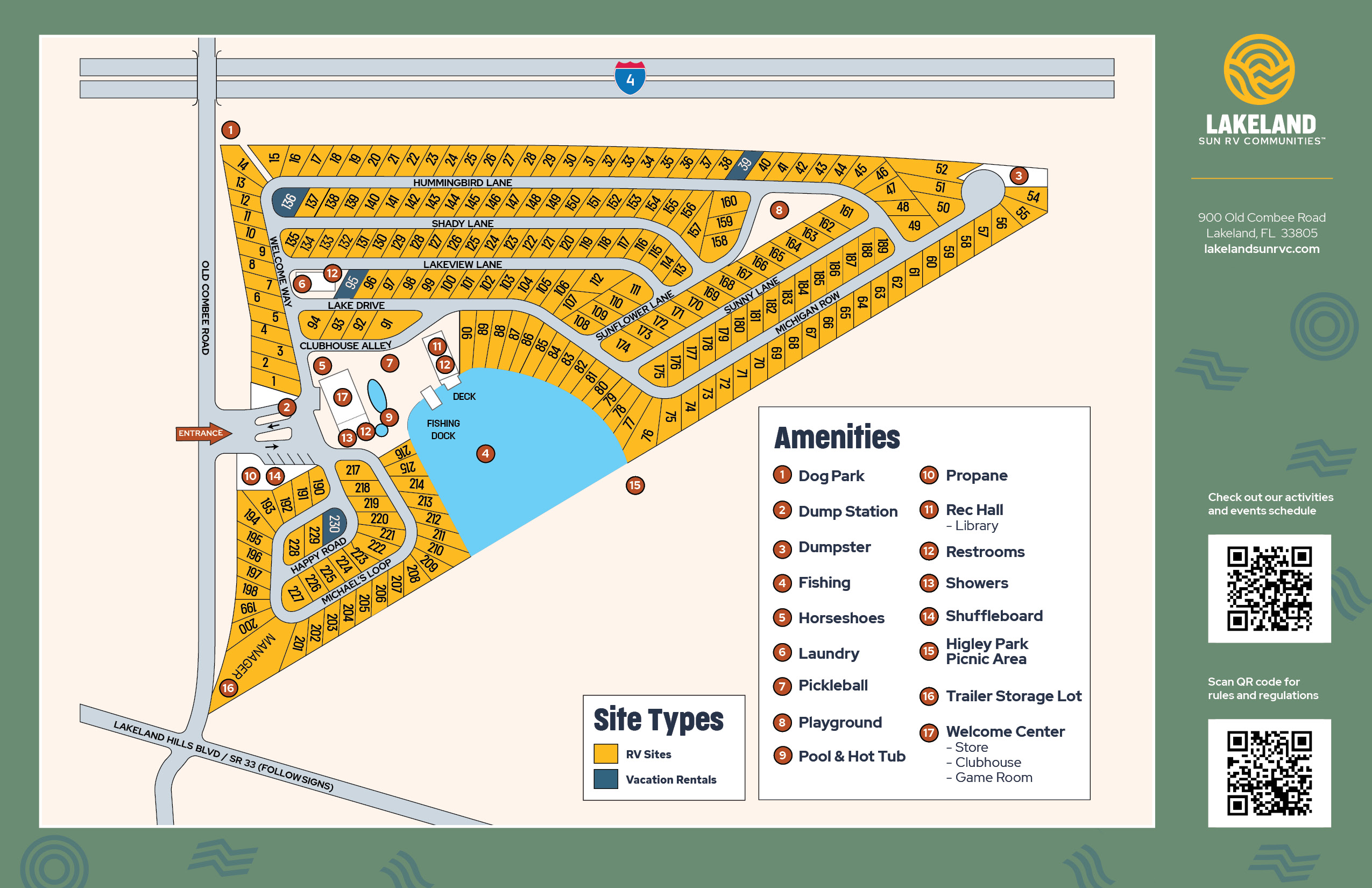 Located midway between the exciting attractions in Tampa and Orlando, Lakeland RV Community is the perfect RV living experience for residents of all ages. We feature over 220 spacious RV sites with full hookup sites and big-rig-friendly options. Lakeland RV Community also has charming park model homes available.