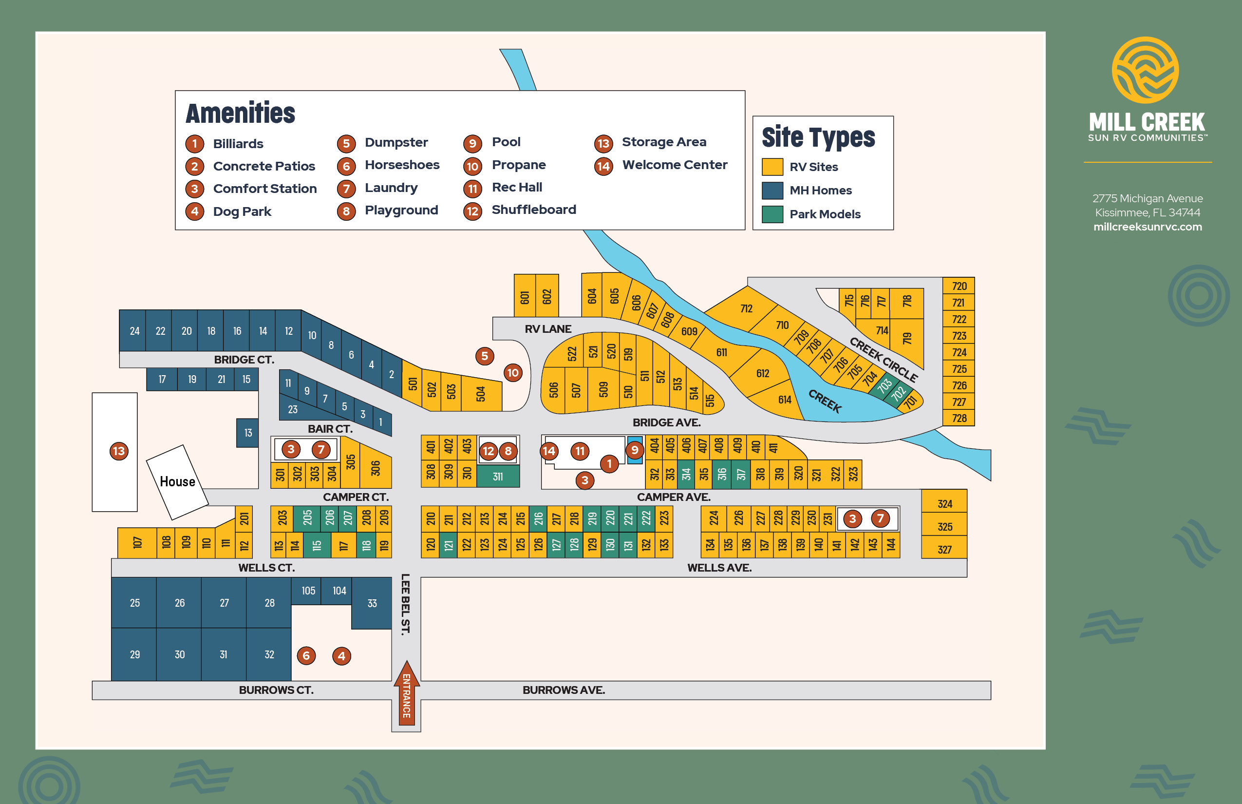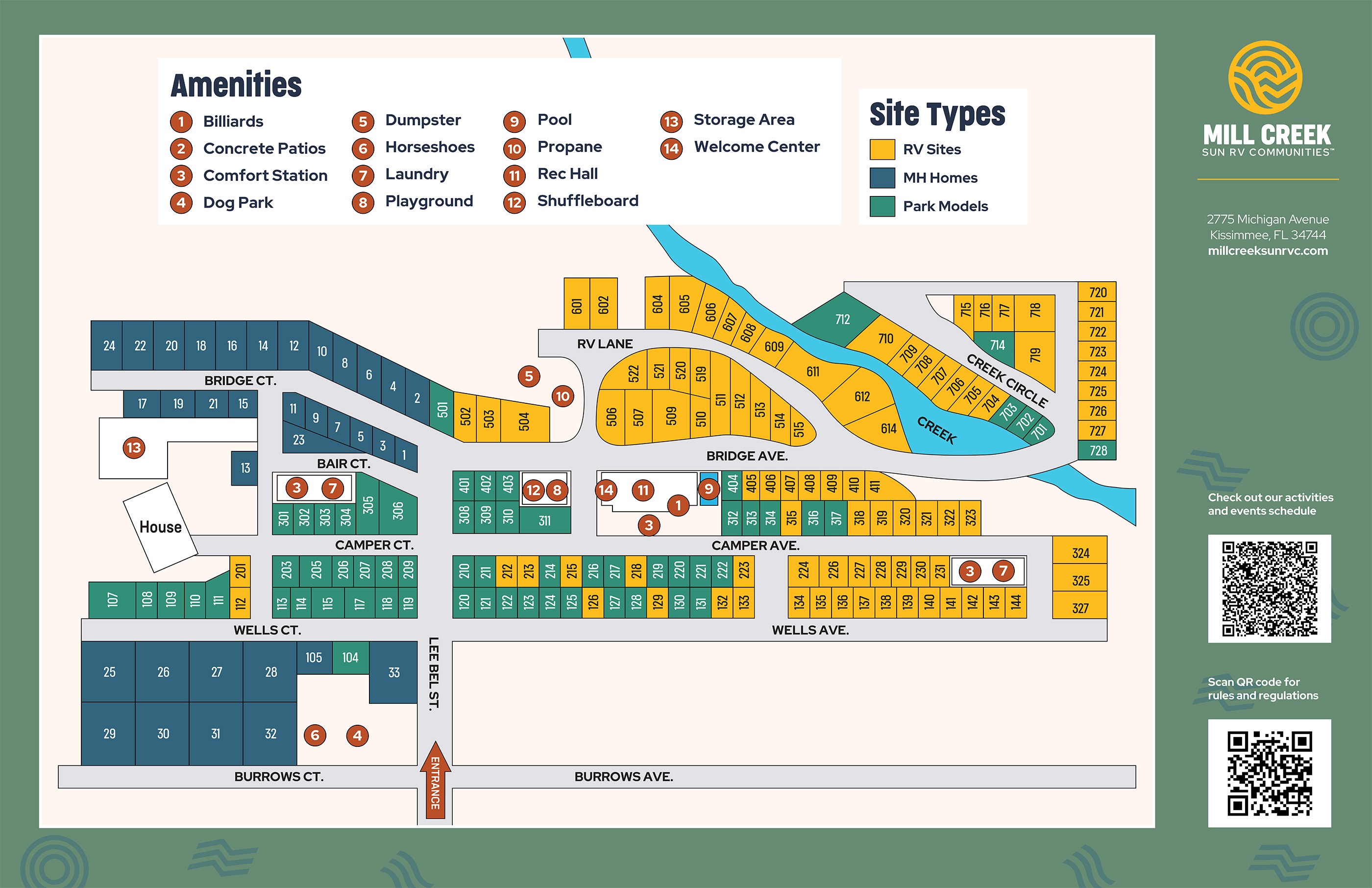 Mill Creek RV Community also offers great community amenities that feature favorites like our heated swimming pool, recreation hall and outdoor shuffleboard courts, plus a dedicated dog park for your four-legged family members.