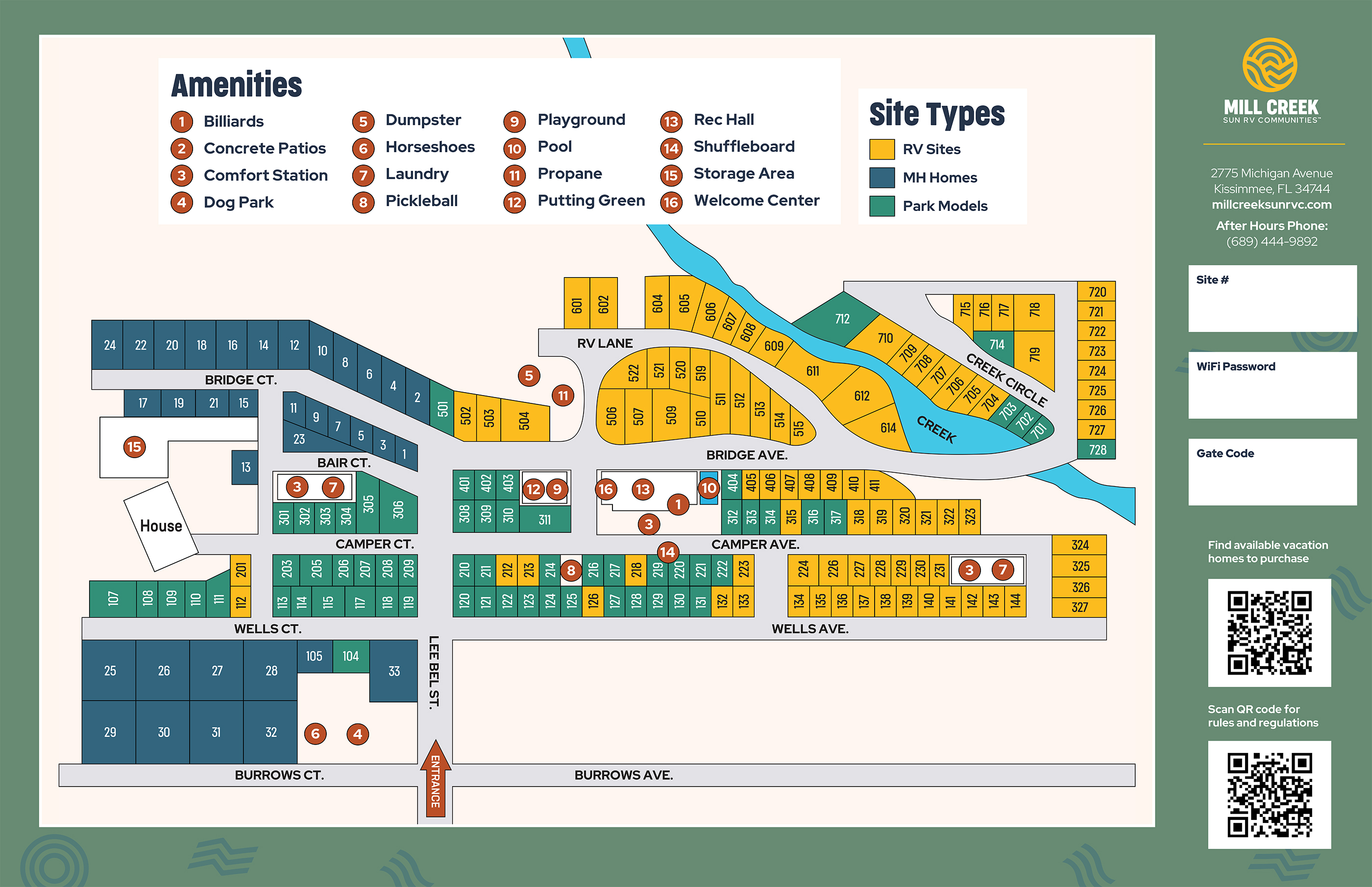 Mill Creek RV Community also offers great community amenities that feature favorites like our heated swimming pool, recreation hall and outdoor shuffleboard courts, plus a dedicated dog park for your four-legged family members.