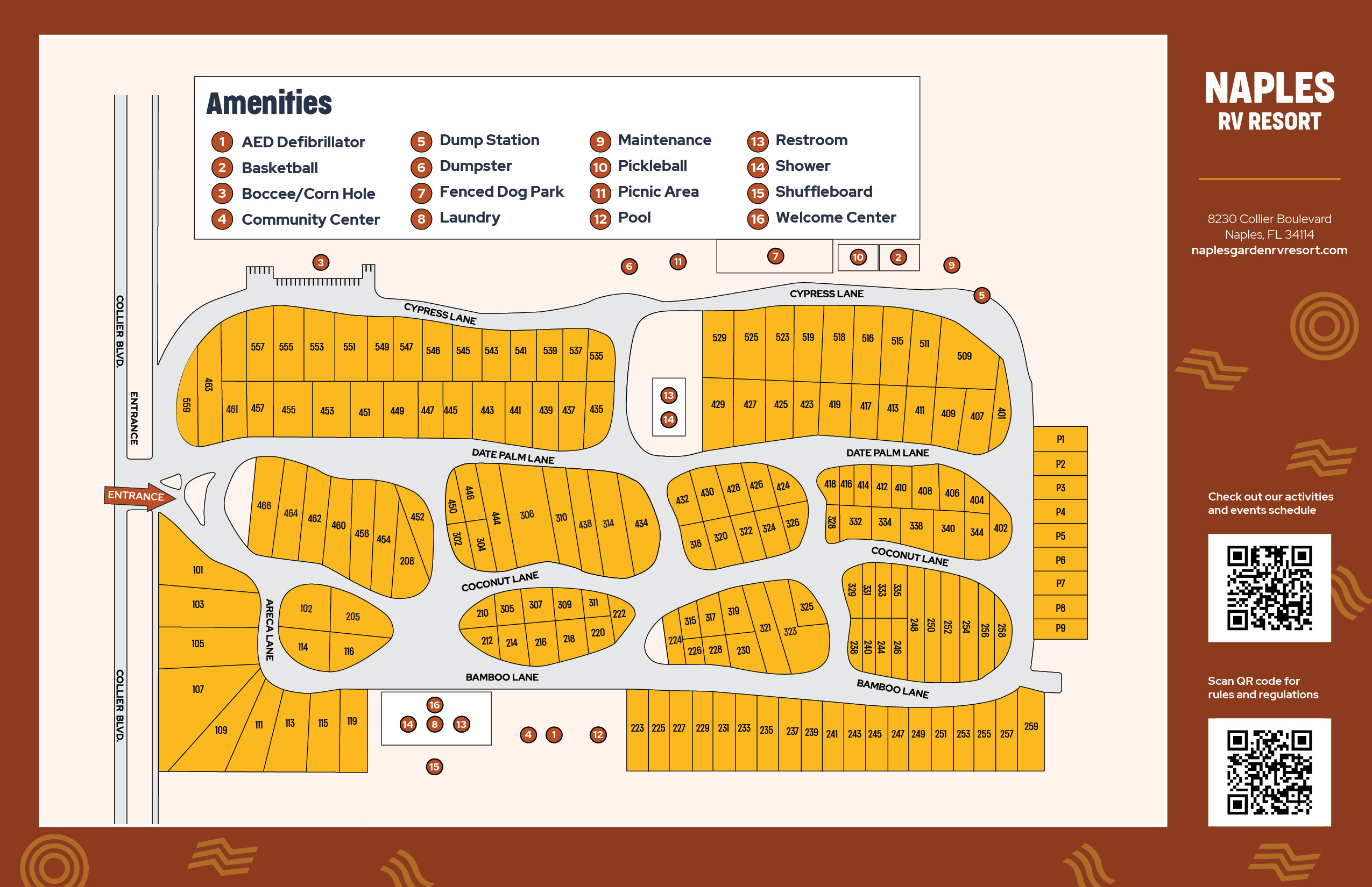 Located in Naples, Florida, our wonderful resort is close to everything yet feels like a secluded oasis. Sites are nestled among hundreds of palms, pines, oaks, cypress, and flowering shrubs.