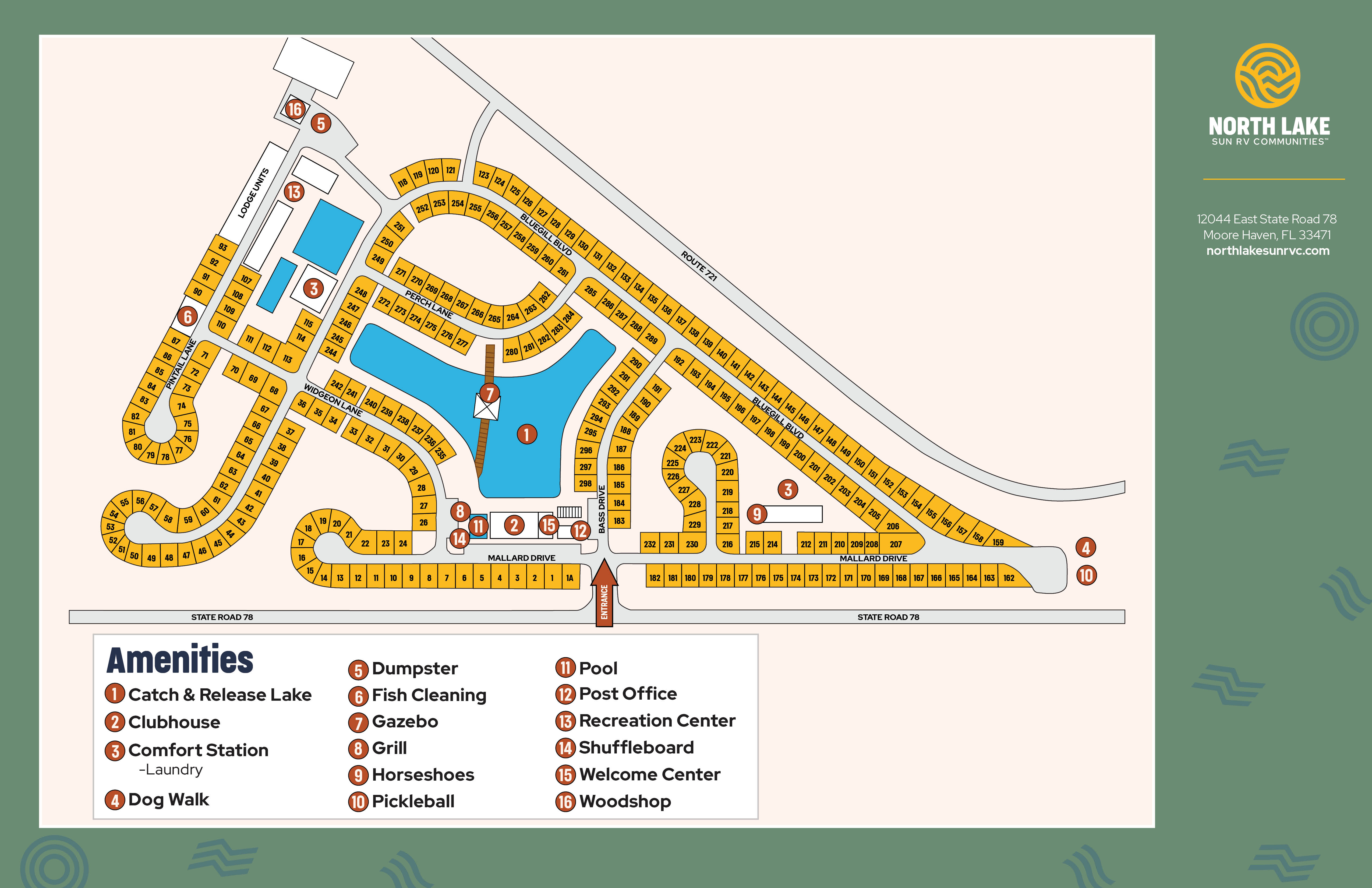 Come and relax near the banks of the Big "O" at North Lake RV Community, formerly known as North Lake RV Community Estates RV Resort. We're situated on the western rim of Lake Okeechobee and provide a relaxing RV living experience at our 55+ community with full range of amenities. Our residents can also enjoy extraordinary views all within miles of countless Florida attractions that include favorites like hunting and fishing.