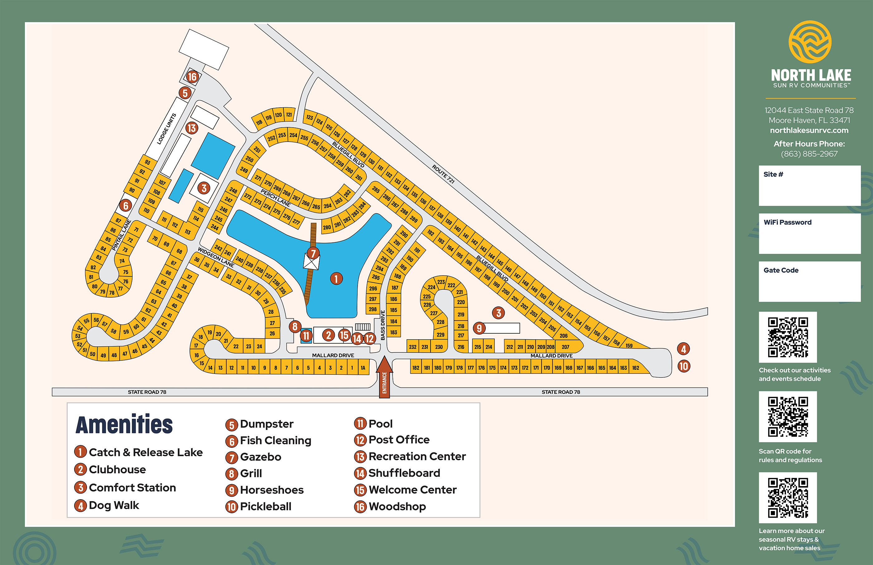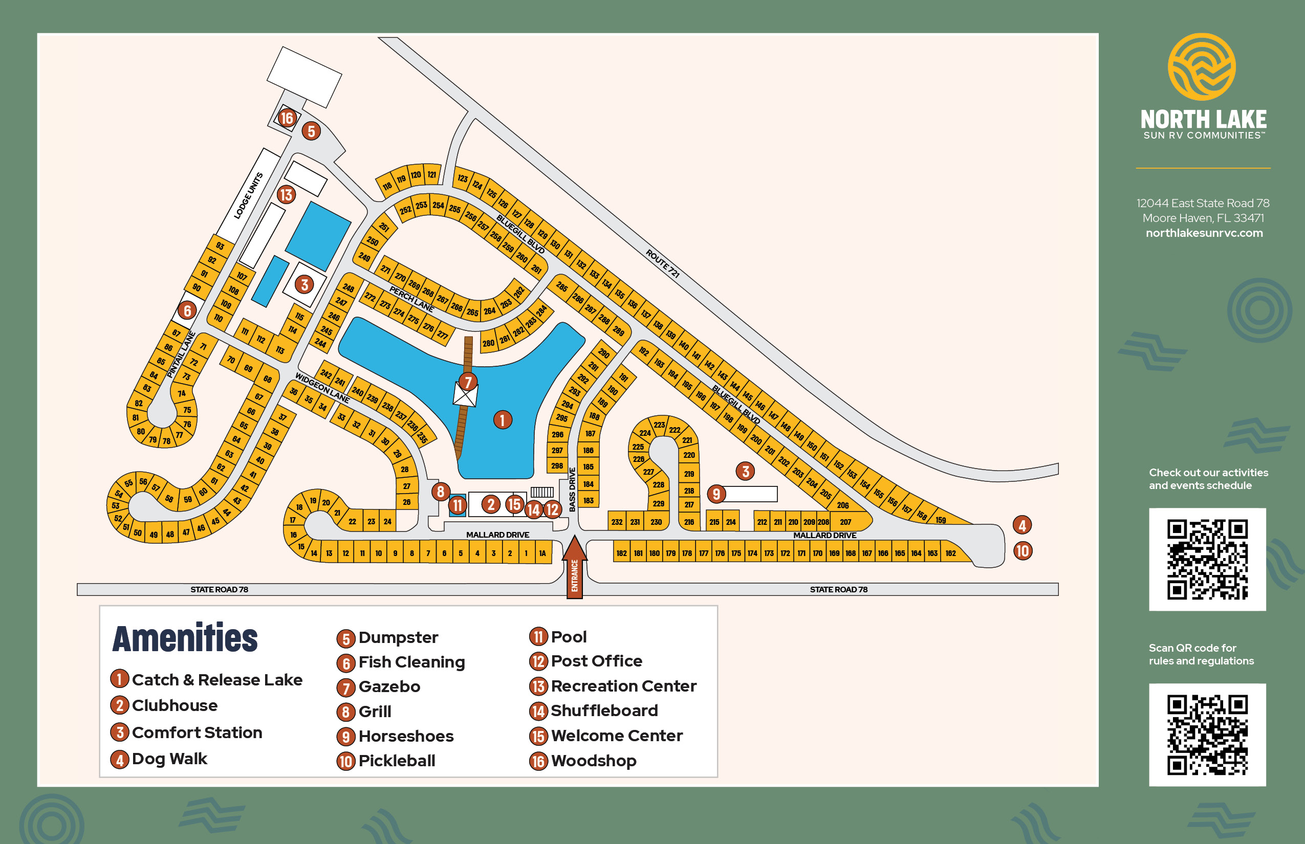 Come and relax near the banks of the Big "O" at North Lake RV Community, formerly known as North Lake RV Community Estates RV Resort. We're situated on the western rim of Lake Okeechobee and provide a relaxing RV living experience at our 55+ community with full range of amenities. Our residents can also enjoy extraordinary views all within miles of countless Florida attractions that include favorites like hunting and fishing.