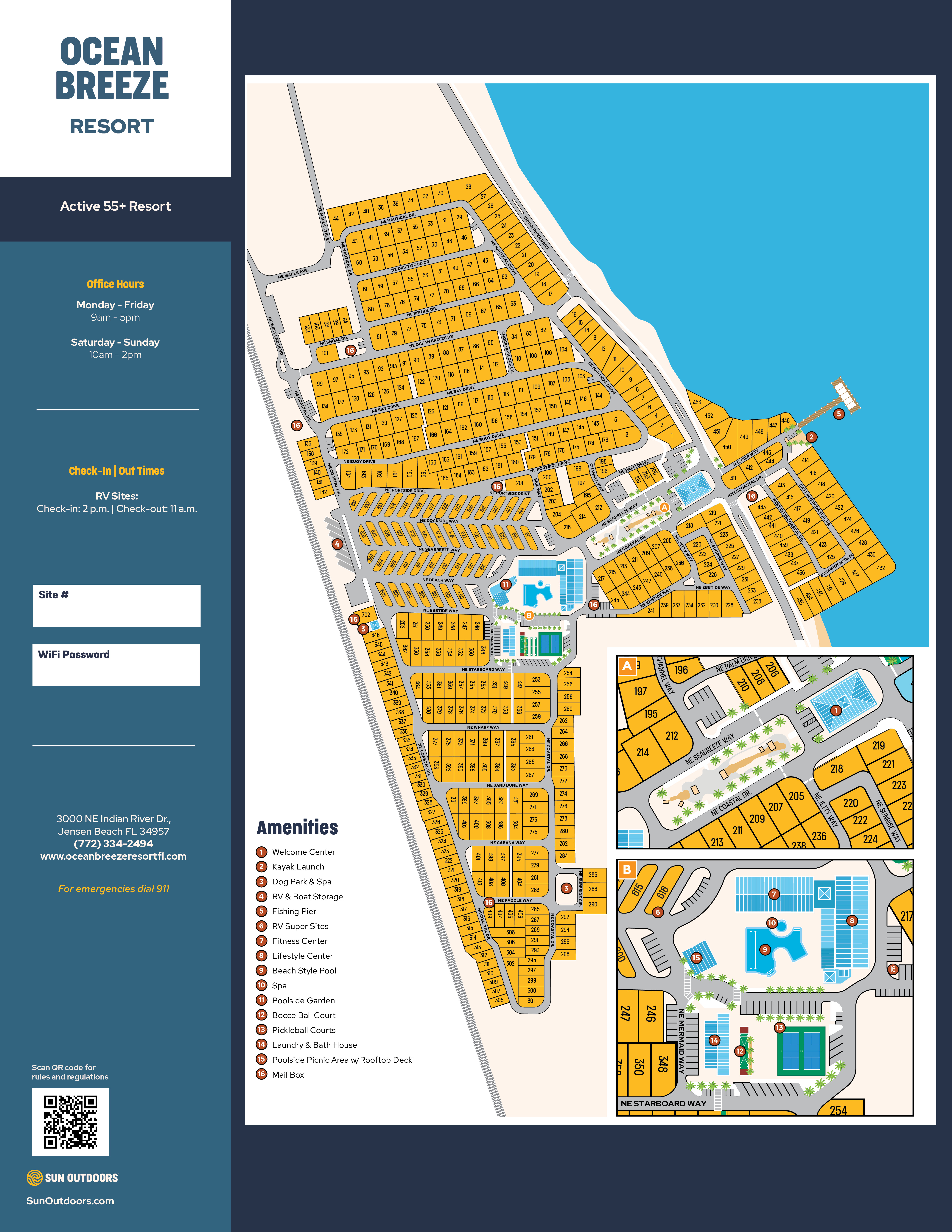 All site numbers are subject to change prior to arrival unless a site lock fee was paid with your reservation. Only certified RV types are permitted unless prevented by specific site constraints, this includes Class A, B, and C Motorhomes, 5th wheels, and travel trailers. We reserve the right to inspect any personal property that you bring into the resort, and we may refuse access if your property is not properly constructed, is unsafe, or is unsuitable for the resort. Tents, pop up campers, and conversion vans are only permitted on designated sites. Sites are designed to accommodate one unit at a time. Only one "pup" tent may act as a secondary unit on a site at the discretion of Sun Outdoors as site size allows, and must be taken down during the day. One dining canopy tent is permitted, but may not be up in conjunction with a "pup" tent, and must be properly secured at all times. Sites must be cleaned up of garbage and debris prior to departure. Additional charges may result for sites requiring additional cleaning.