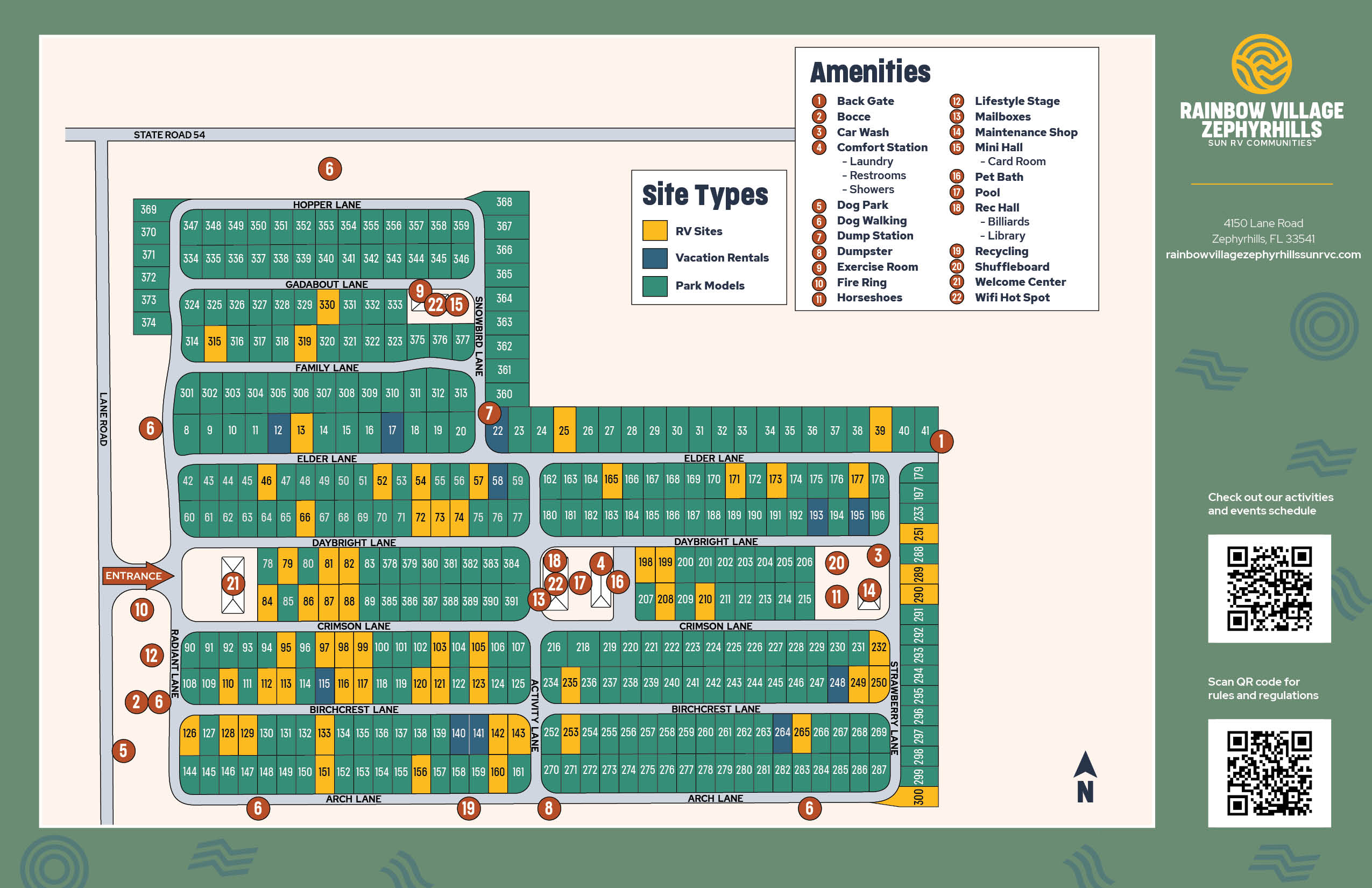 Enjoy the charm of small town living perfectly combined with modern conveniences and the warm Florida sunshine at Rainbow Village Zephyrhills RV Community. Our active 55+ community in Central Florida offers full hookup RV sites with 30- or 50-amp electric service, plus a selection of rental home options.