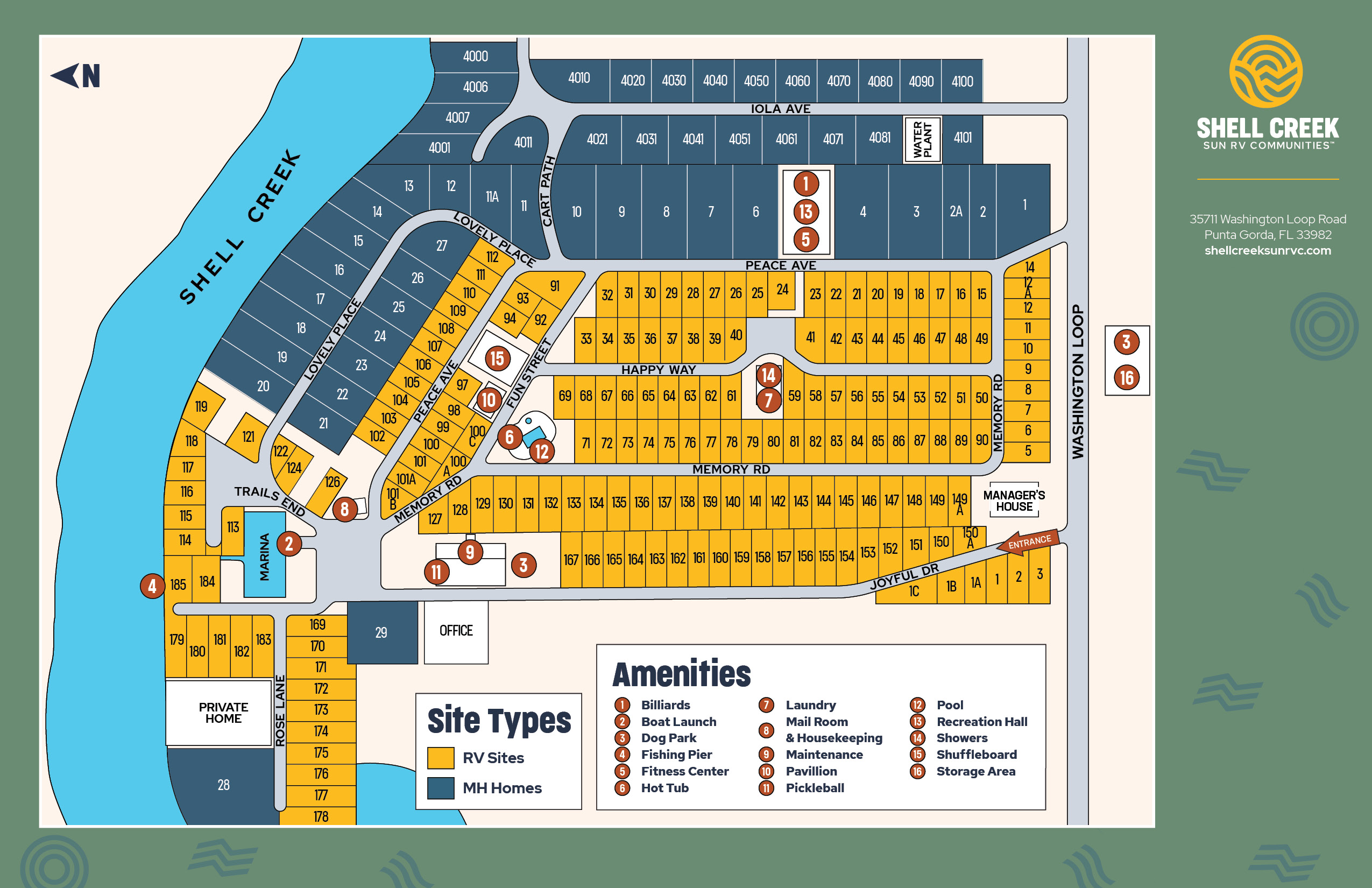 If water sports aren't your thing, our grounds also feature amenities and activities that include favorites like shuffleboard, horseshoes, and billiards. Shell Creek RV Community also has over 230 full hookup RV sites with 30- and 50-amp service, as well as a great selection of homes to rent or buy.