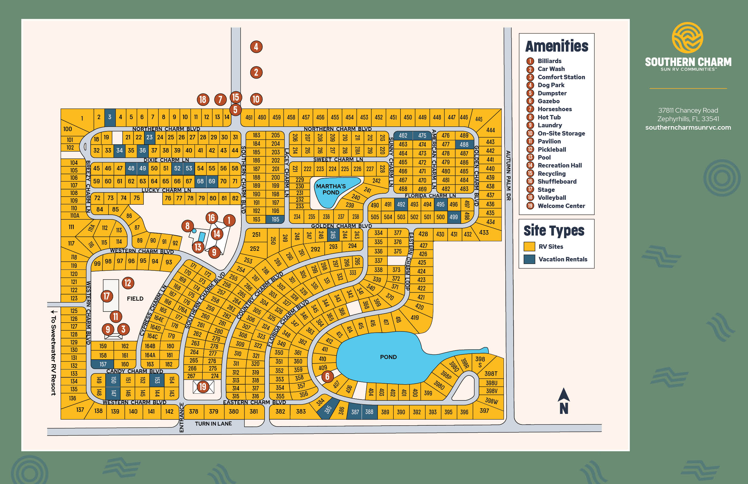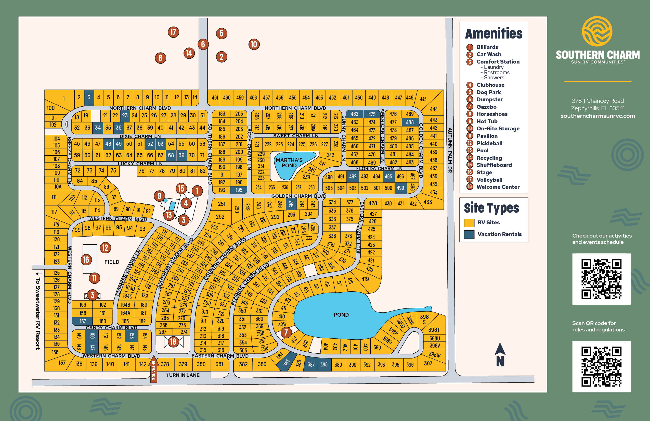 Enjoy warm hospitality of Southern Charm RV Community in historic Zephyrhills. Our ideal location in Central Florida allows residents to enjoy the Tampa Bay area, known as Rally Central, with plenty of space and great facilities to handle events of all sizes.