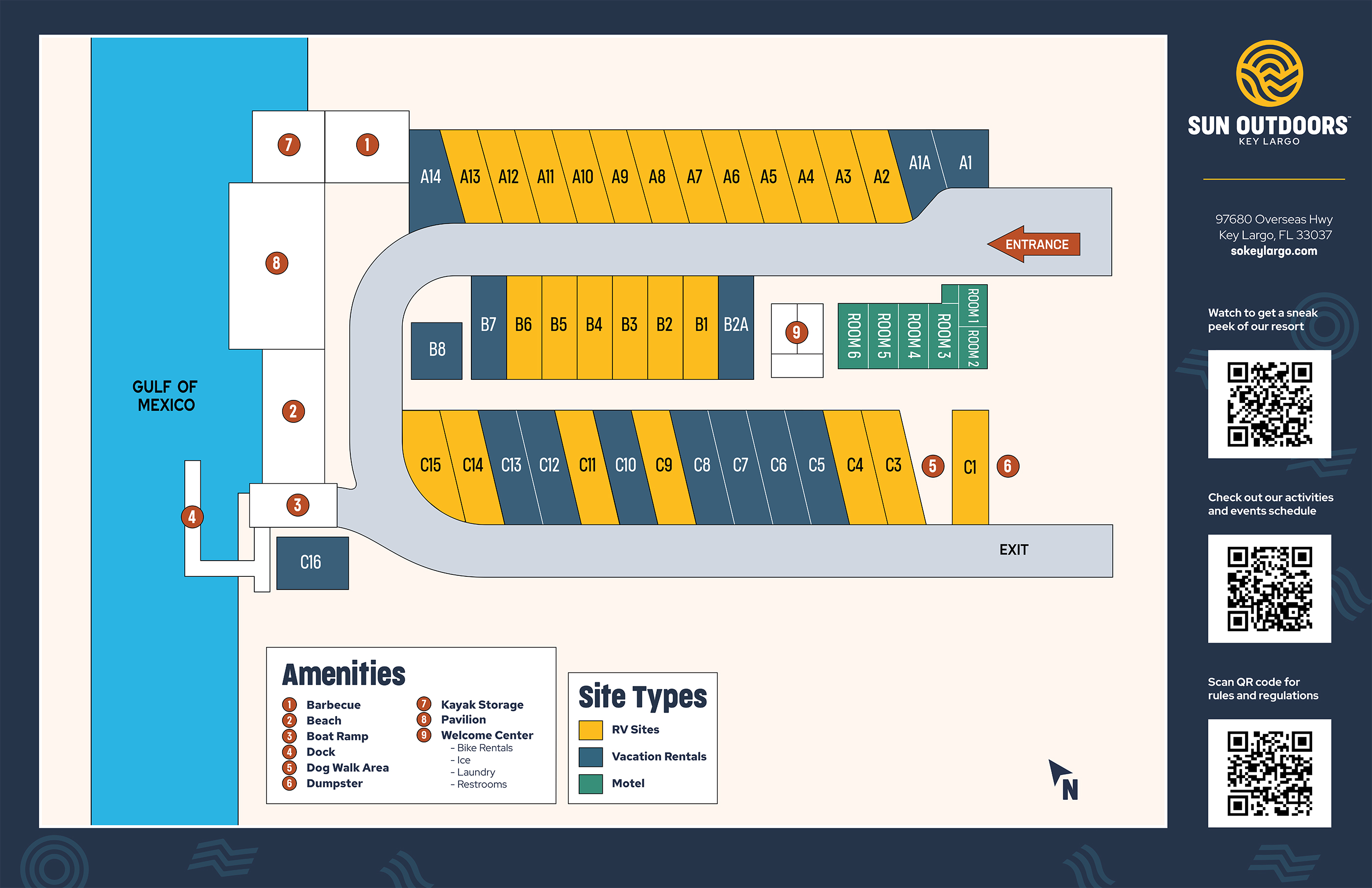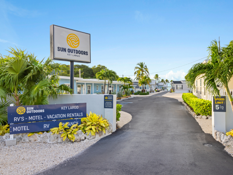 Situated at mile marker 97.5, Sun Outdoors Key Largo, formerly Riptide RV Resort & Marina, is one of the most scenic and convenient RV parks in the Florida Keys. This Key Largo resort offers 35 full-hookup sites with cable TV and WiFi service. Park your RV, book a room in our duplex or charming motel or rent one of our vacation cottages for amazing vacations in the beautiful Florida Keys.