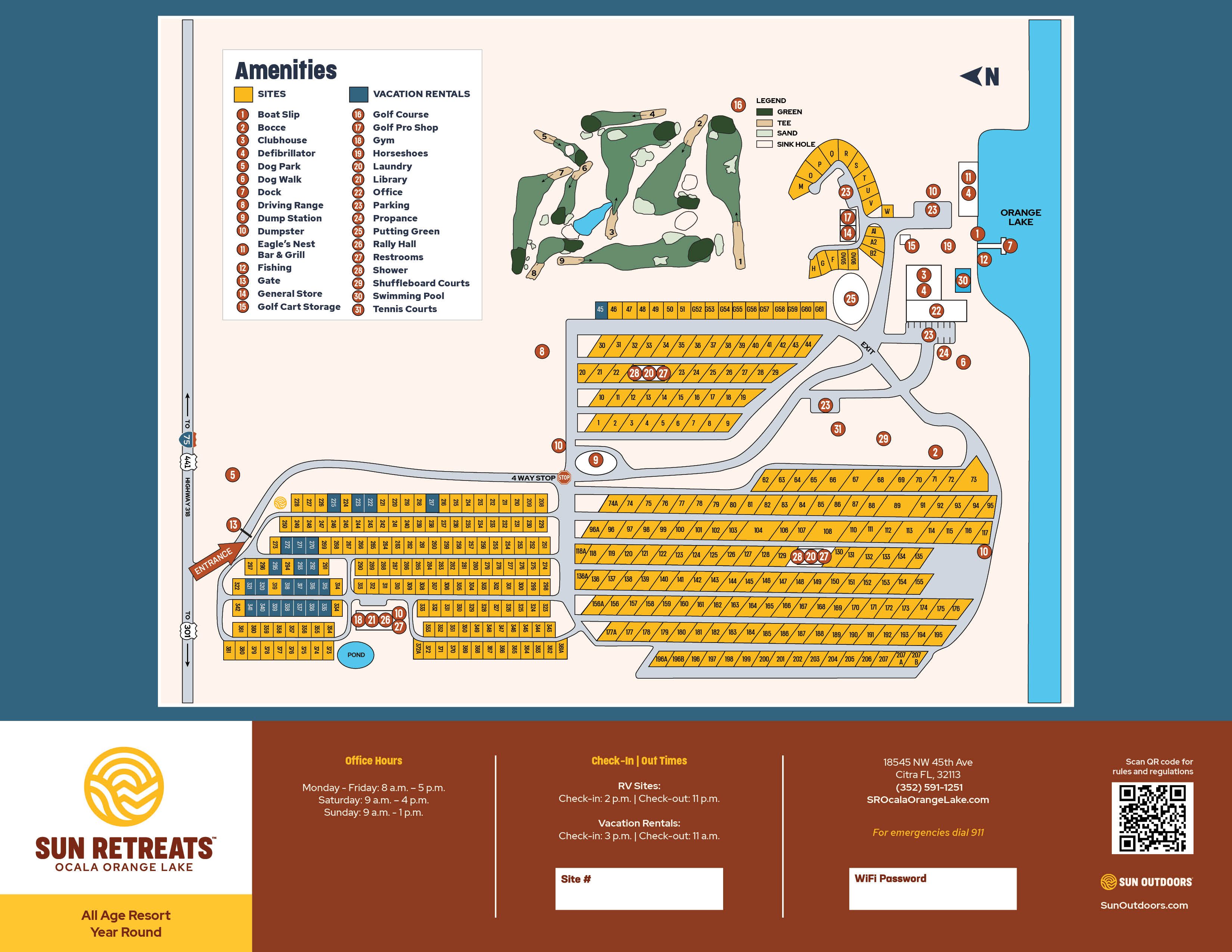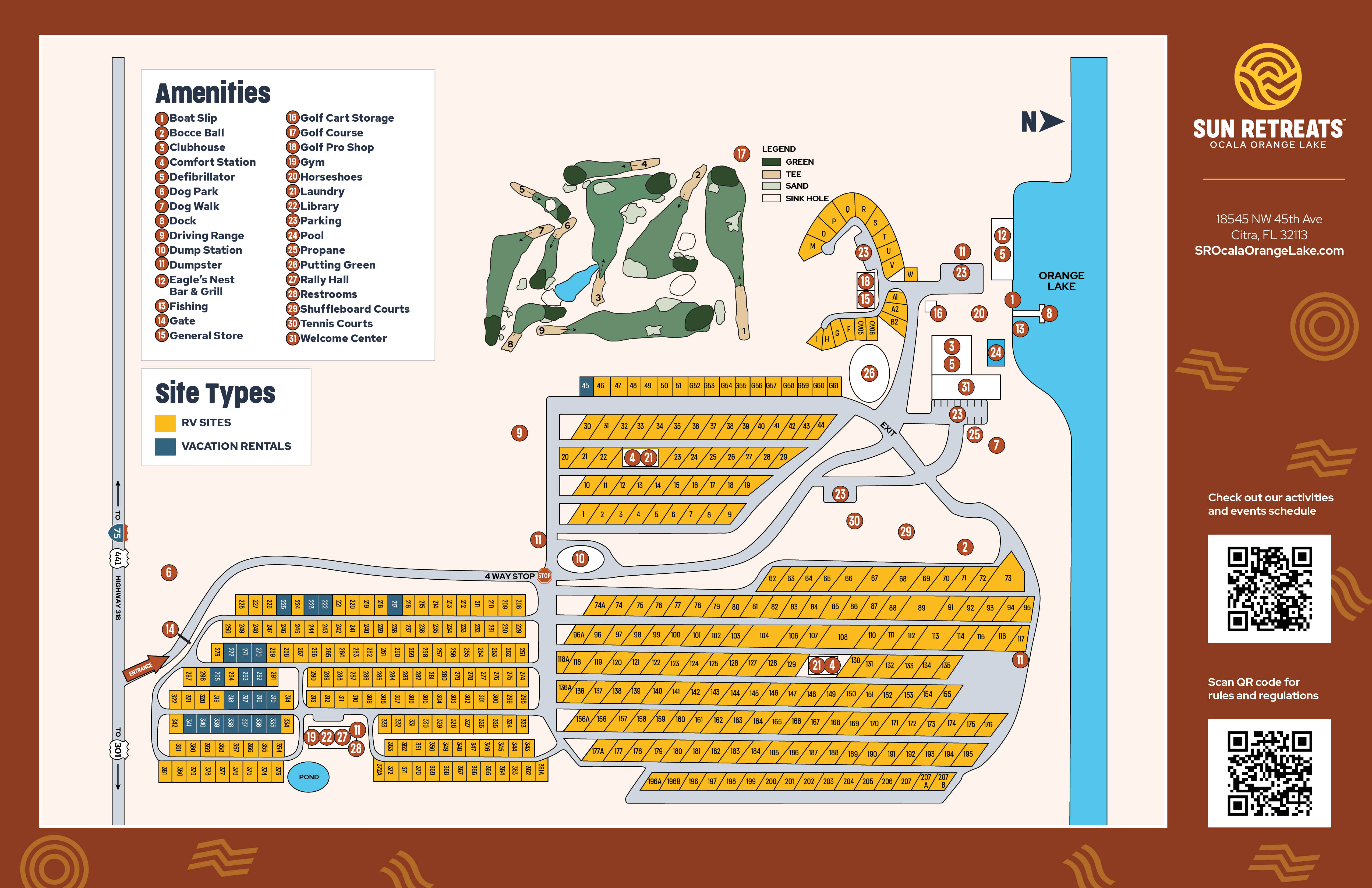 Rated "One of the Top Nine Resorts in the United States" by USA Today and given a 5-star rating by Woodall's, Sun Retreats Ocala Orange Lake immerses you in central Florida's natural beauty and seclusion mixed with a wonderful Florida RV resort experience.