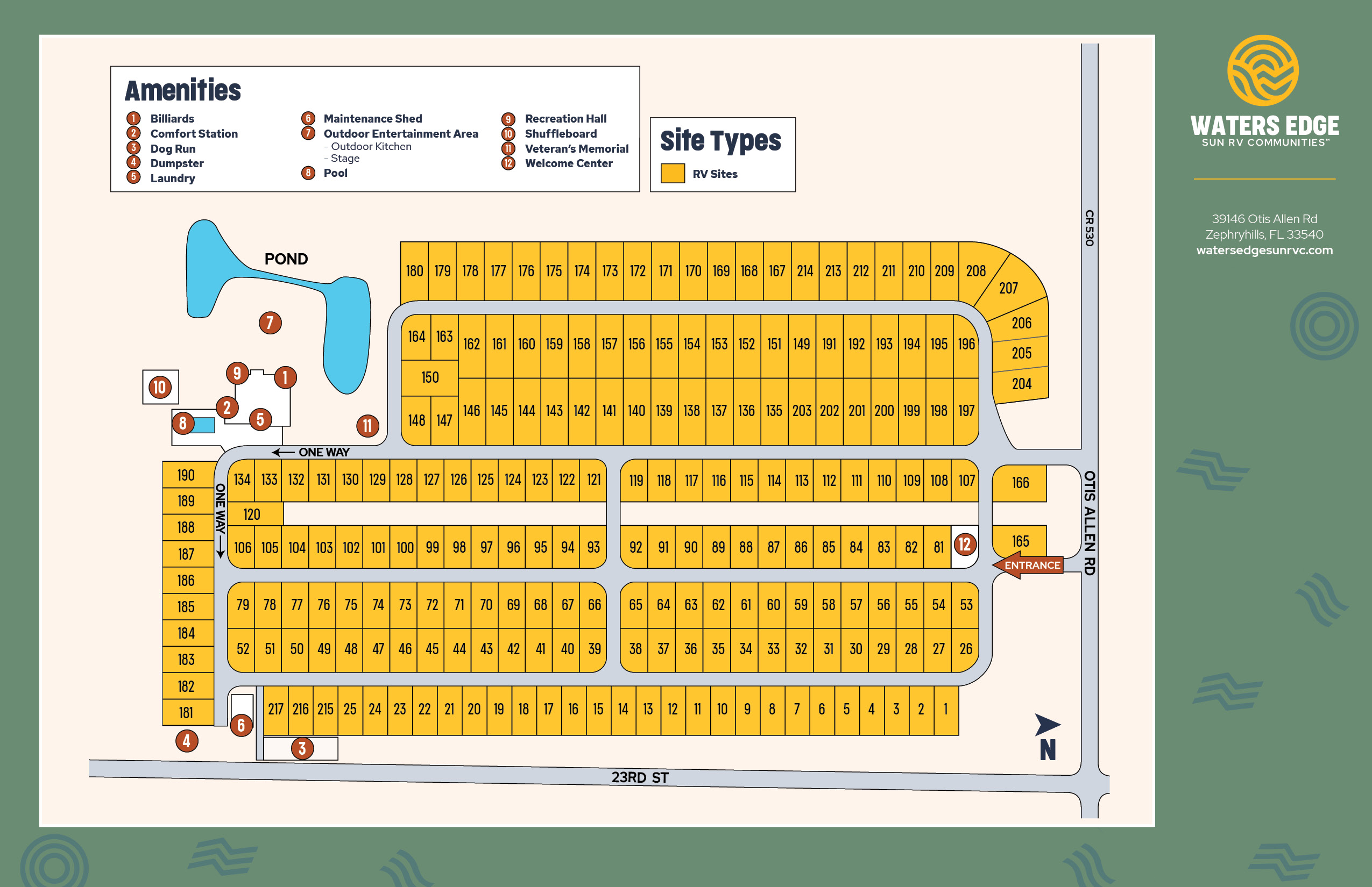 Enjoy old-fashioned fun in the Florida countryside of Zephyrhills at Waters Edge RV Community. Located 30 miles northeast of Tampa on the Gulf Coast, our active 55+ community offers over 200 full hookup sites, as well as one- and two-bedroom rental homes and home sales.