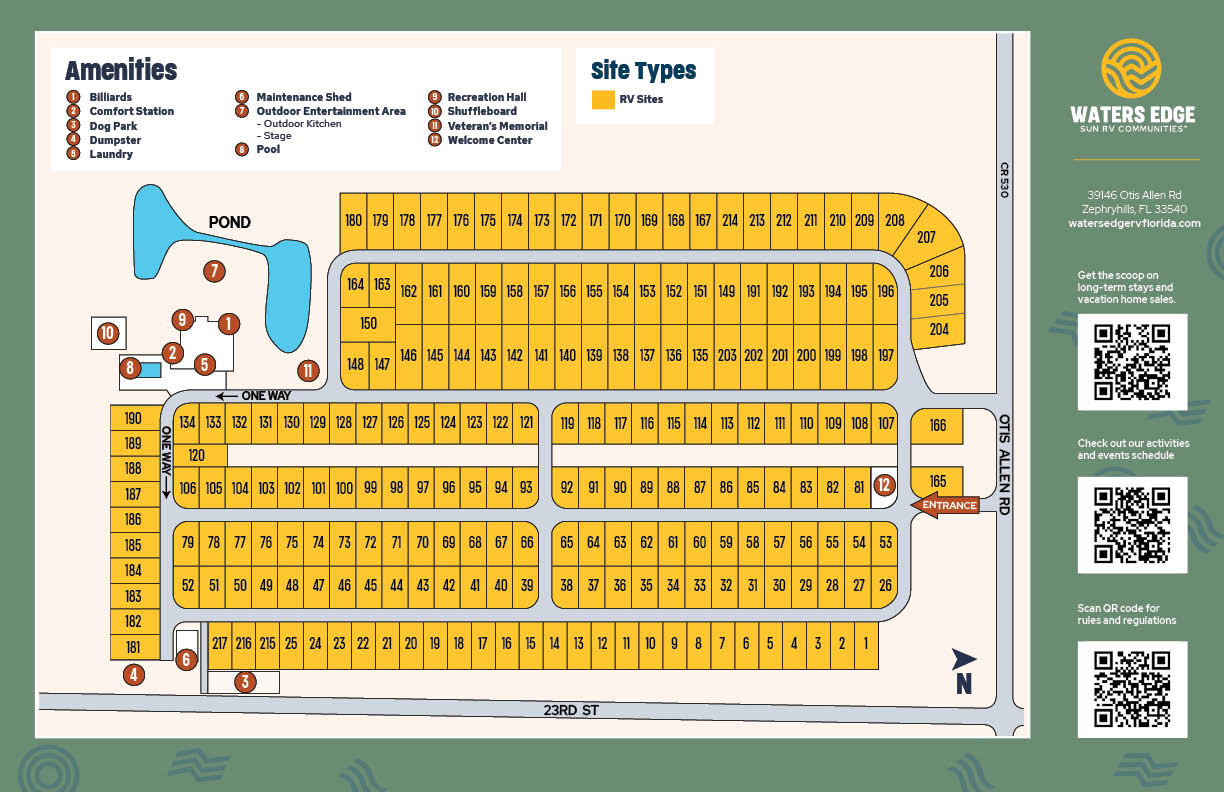 Enjoy old-fashioned fun in the Florida countryside of Zephyrhills at Waters Edge RV Community. Located 30 miles northeast of Tampa on the Gulf Coast, our active 55+ community offers over 200 full hookup sites, as well as one- and two-bedroom rental homes and home sales.
