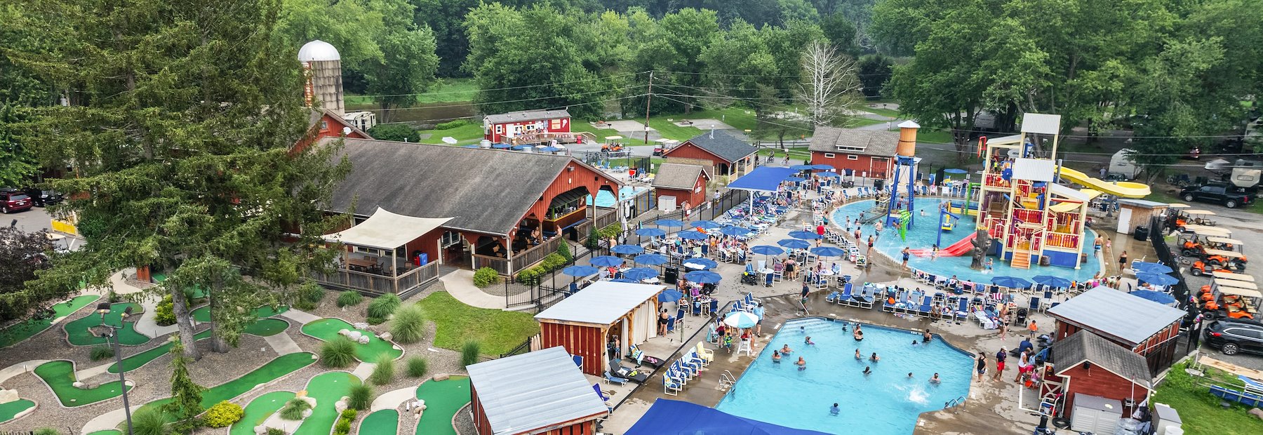 Enjoy endless amounts of fun from sun up to sun down at our New York Camp-Resort! Enjoy access to our huge water park, swimming pools, mini golf course, jumping pillows, playground, sports courts, and more. Non-peak season attractions have reduced availability.