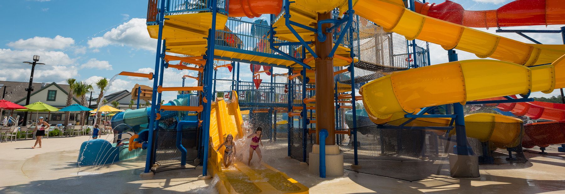 Jump in and have a blast with the kids at the Carolina Splash Water Park. Cool off and play in the Sun Outdoors Myrtle Beach sun at our water park featuring twisting water slides, sprays, a giant bucket that dumps thousands of gallons of water, a splash pad, relaxing cabanas, heated lazy river and outdoor concessions.