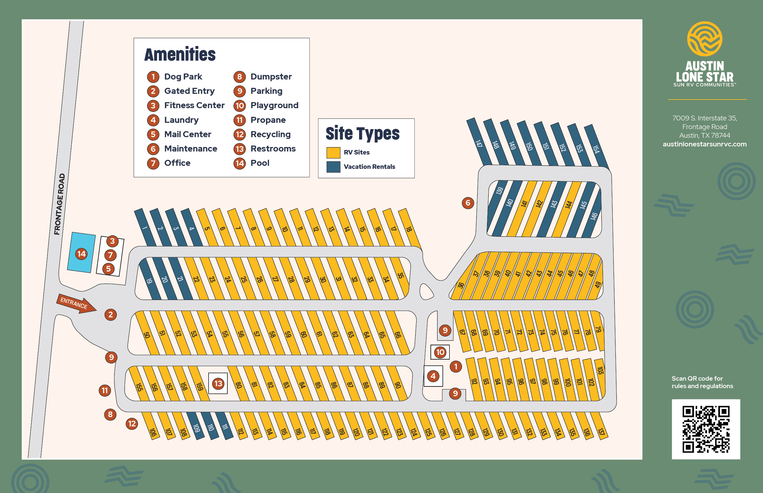 At Austin Lone Star Sun RV Community, you're not just parking your RV — you're joining a vibrant, welcoming community. Our resort-style amenities and close proximity to Austin's incredible music, food, and cultural scene make it easy to enjoy both the quiet comforts of home and the energy of city life. Whether you're enjoying a stroll under the trees, relaxing by the pool, or exploring local events, there's something for everyone.