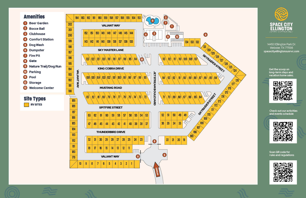 Discover affordable Texas RV living at Space City Ellington RV Community in Webster. Our family-friendly community offers residents a prime location between Houston and Galveston, right next to the NASA Space Center. We also provide spacious RV sites that include cement pads and full hookups with 30- or 50-amp electric.