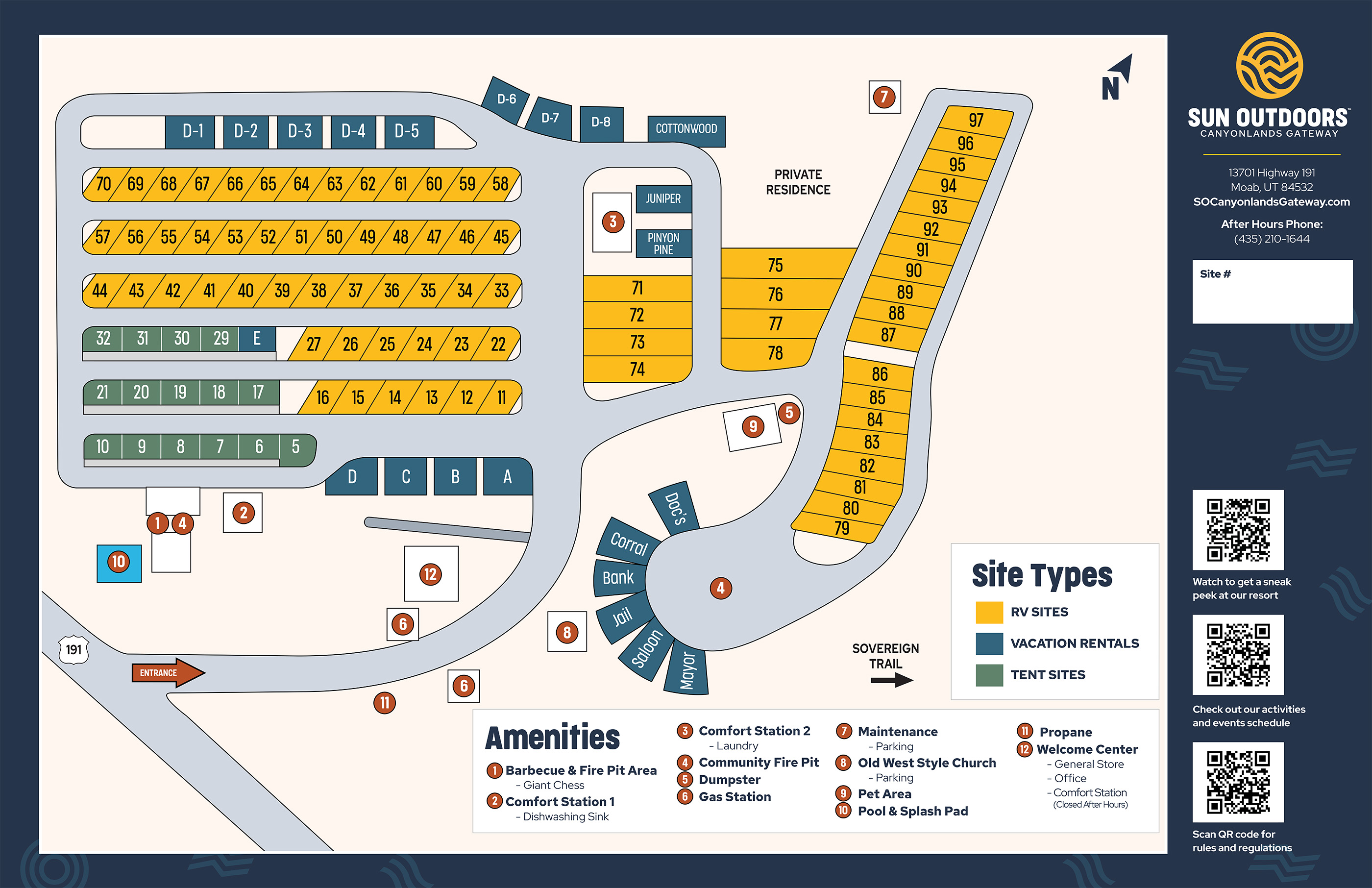 Our resort features a variety of accommodations to suit your needs, including RV sites, camping sites, and vacation rentals such as cabins, casitas, and cottages. With easy access to nearby walking trails like the Mesa Arch Trail, Grand View Point Trail, and White Rim Overlook Trail, you'll find endless opportunities to immerse yourself in the natural beauty of the area. For those looking to venture further, our proximity to national parks ensures that breathtaking landscapes and unforgettable experiences are just a short drive away.