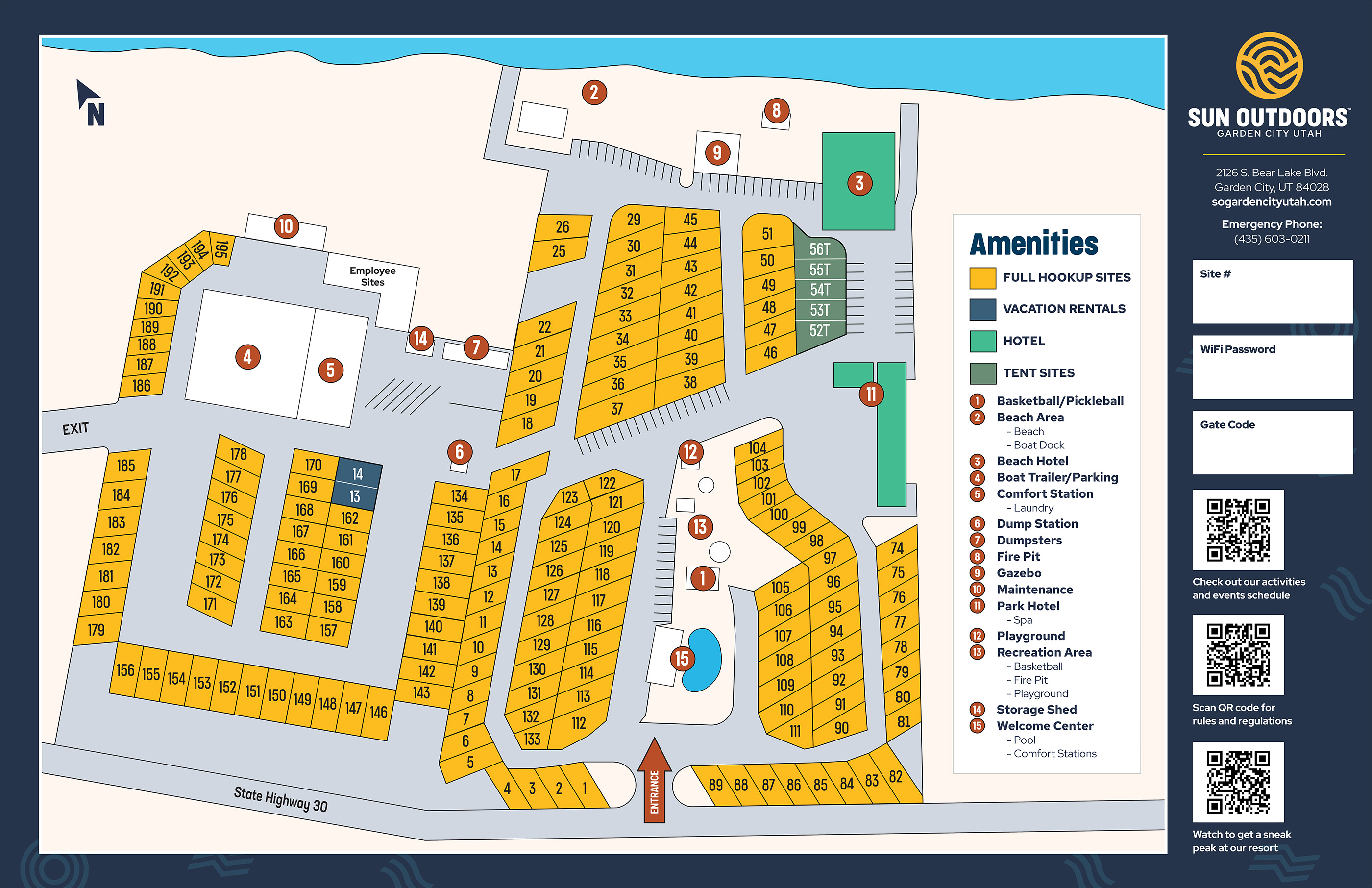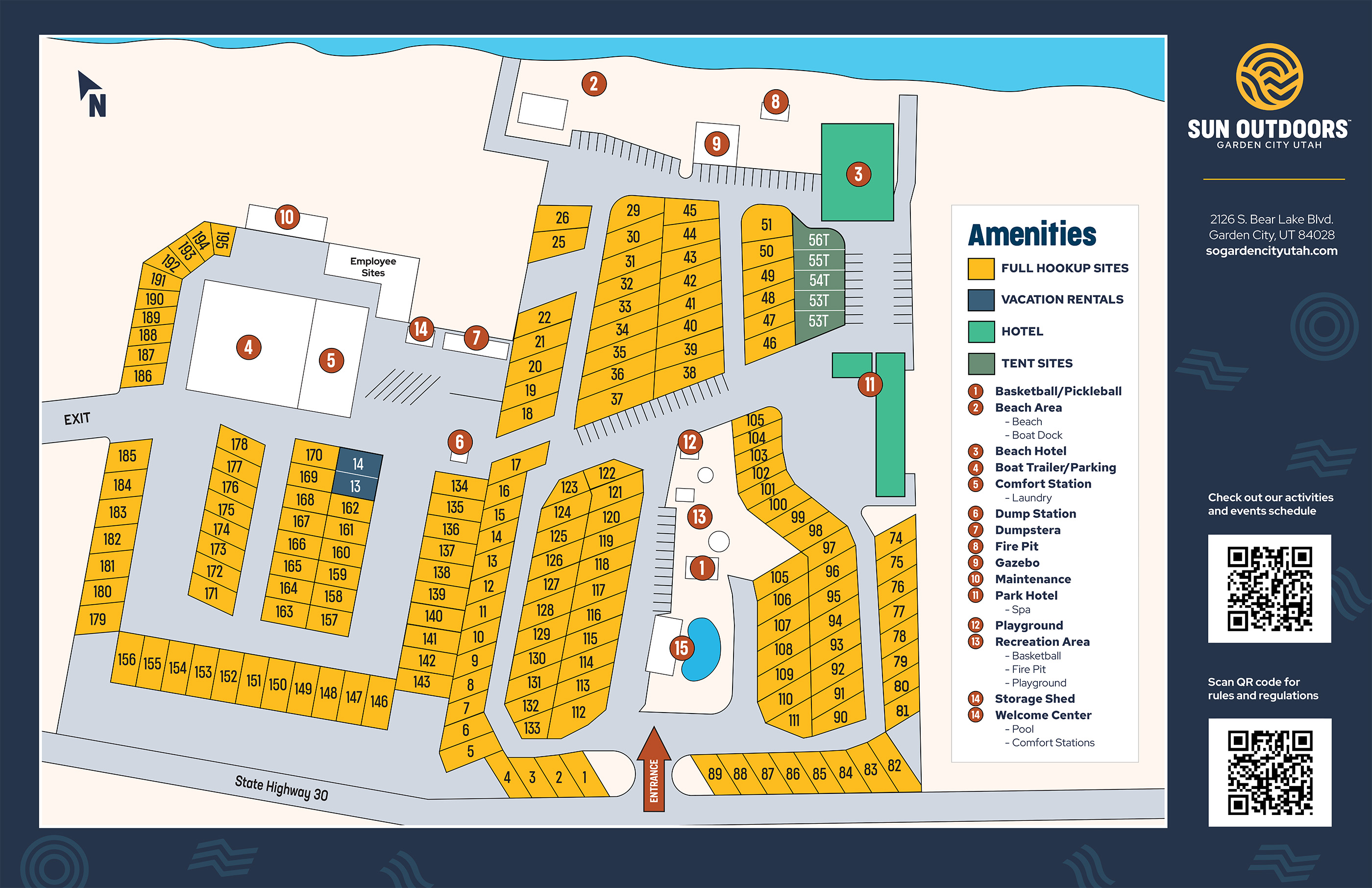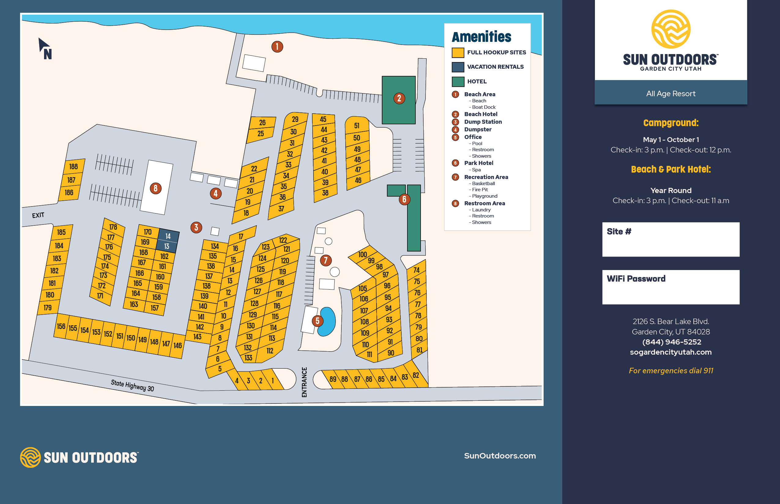 Discover the perfect family getaway at Bear Lake when you visit Sun Outdoors Garden City Utah. Located just 8 miles south of Idaho, our resort offers a blend of relaxation and adventure. Spend your days building sandcastles on the beach, swimming in the crystal-clear waters, and exploring the scenic beauty of Bear Lake with a boat rental!