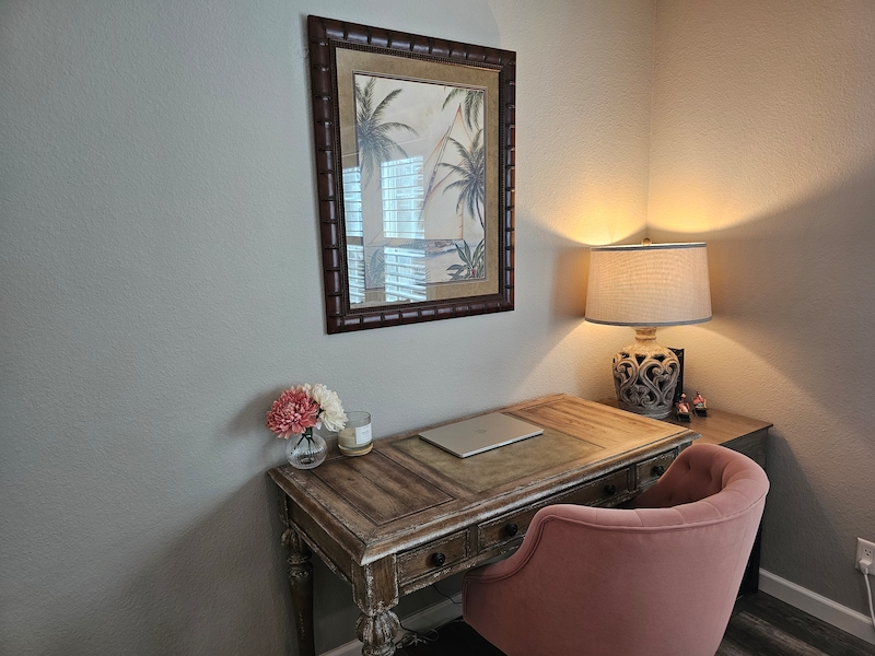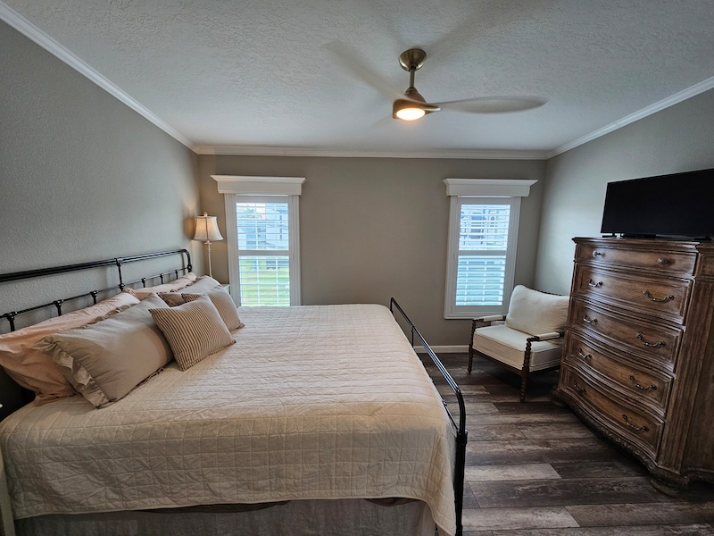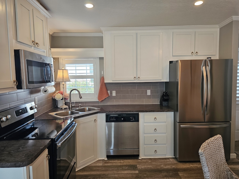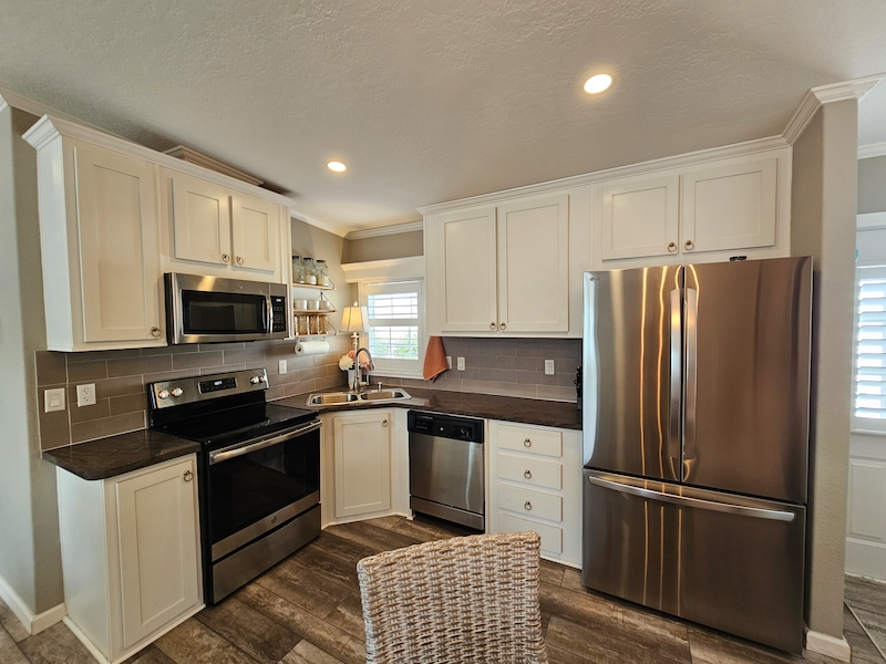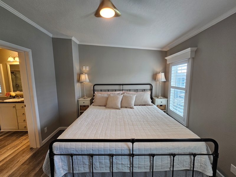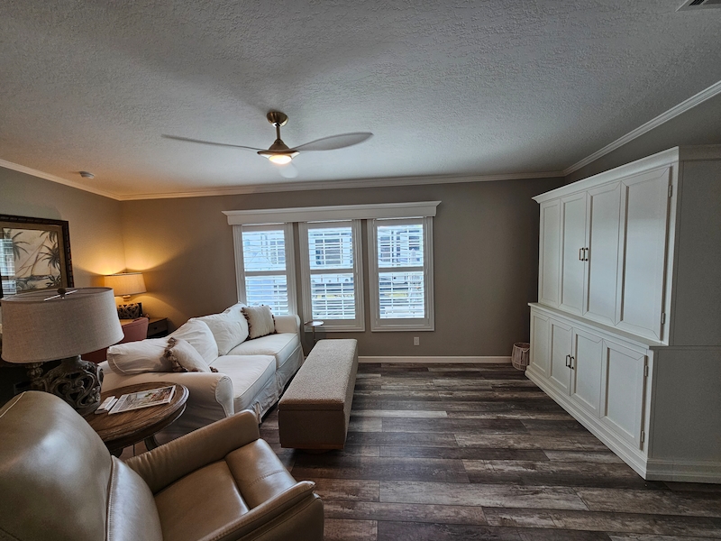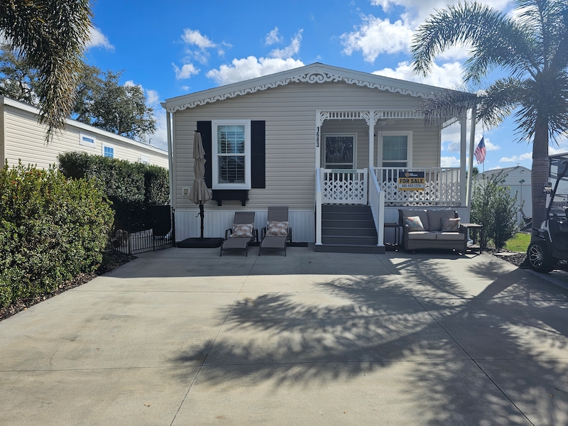 Recently decorated with brand new furnishings and custom-made plantation shutters. Excellent functional living space with 2 bedrooms and 2 full baths. Open living, dining & kitchen featuring stainless steel appliances and fixtures. Convenient full-size washer and dryer with laundry area. This unit has never been used as a rental and is in excellent condition. It is also one of very few extra-long double wide units that are no longer allowed in the park but is grandfathered in along with the oversized shed. Highly desirable location with lots of sunlight, large private patio with fenced in area for your pet. Spacious parking for at least 2 vehicles and a golf cart. The outdoor area is perfect for entertaining or just a quiet evening on the front porch. Boasting a larger lot and great access to pickle ball. The new warm, natural detailing throughout make this stunning home ready for move-in! This gorgeous modern home features: ~ drywall interior that was recently painted in a neutral tone ~ unique crown molding and window valances ~ custom made wood window shutters ~ basement area for storage ~ 3 brand new TV’s ~ Sleeps 6+ (queen size slipcovered sofa, king bed in master, queen bed in guest room) ~ newly installed lighting and ceiling fans ~ extra-long double wide with front porch ~ extra large shed ~ fenced in pet areaFeatures
