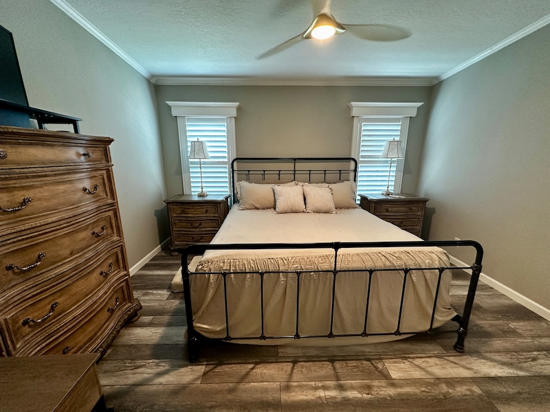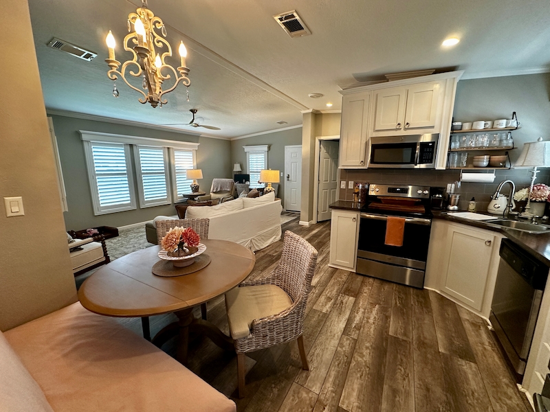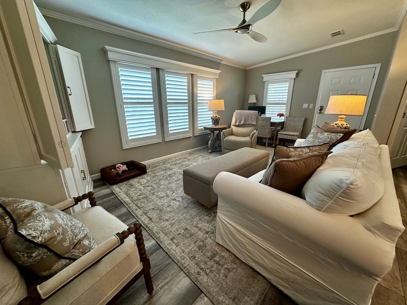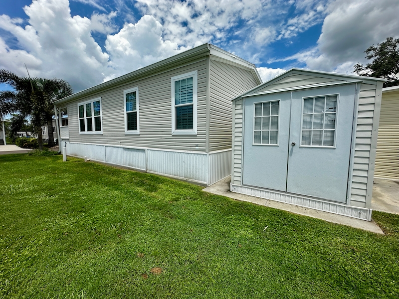Recently decorated in March of 2025 with brand new furnishings and custom-made plantation shutters. Excellent functional living space with 2 bedrooms and 2 full baths. Open living, dining & kitchen featuring stainless steel appliances and fixtures. Convenient full-size washer and dryer with laundry area. This unit has never been used as a rental and is in excellent condition. It is also one of very few extra-long double wide units that are no longer allowed in the park but is grandfathered in along with the oversized shed. Highly desirable location with lots of sunlight, large private patio with fenced in area for your pet. Spacious parking for at least 2 vehicles and a golf cart. The outdoor area is perfect for entertaining or just a quiet evening on the front porch. Boasting a larger lot and great access to pickle ball. The new warm, natural detailing throughout make this stunning home ready for move-in! This gorgeous modern home features: ~ drywall interior that was recently painted in a neutral tone ~ unique crown molding and window valances ~ custom made wood window shutters ~ basement area for storage ~ 3 brand new TV’s ~ Sleeps 6+ (queen size slipcovered sofa, king bed in master, queen bed in guest room) ~ newly installed lighting and ceiling fans ~ extra-long double wide with front porch ~ extra large shed ~ fenced in pet areaFeatures