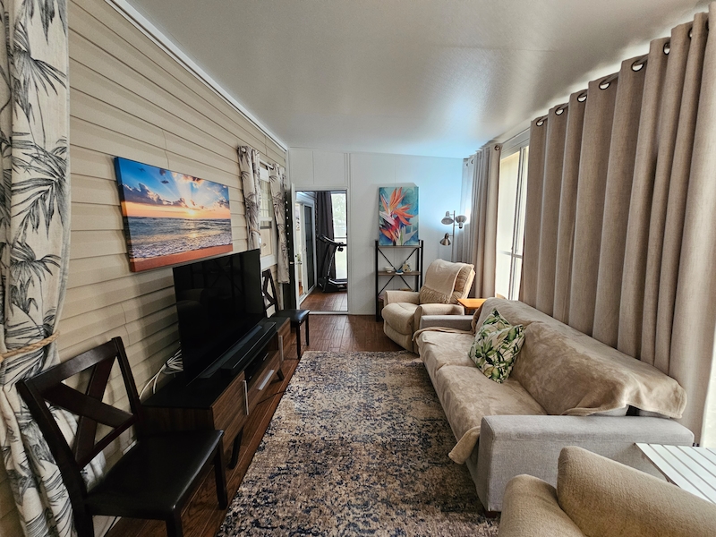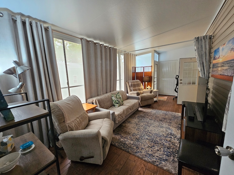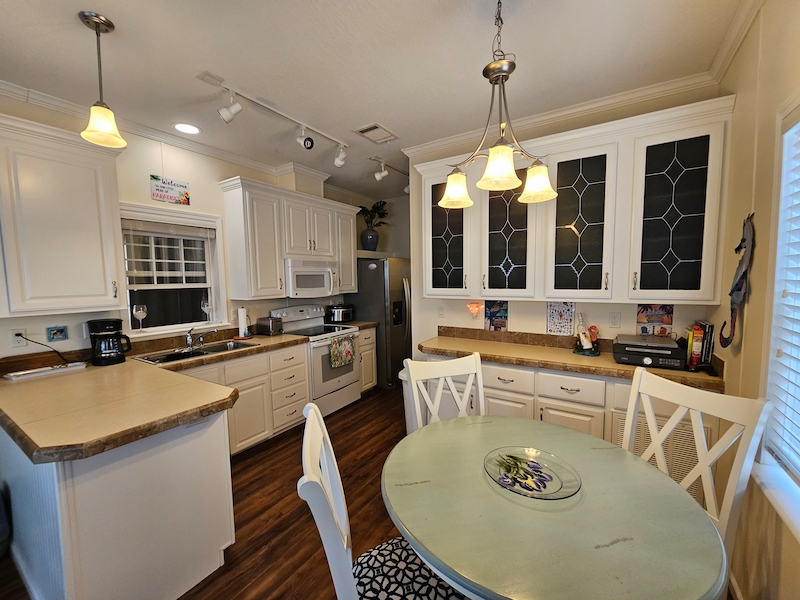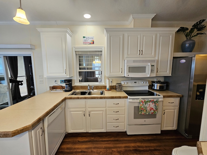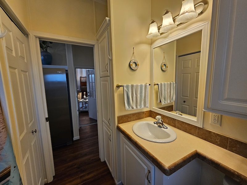 Welcome to this beautifully upgraded home, perfectly positioned in the heart of the community—just steps away from all the resort-style amenities. Situated on a rare double lot, this property offers extra space, privacy, and flexibility that’s hard to find. Inside, you’ll find a thoughtfully enhanced interior featuring high ceilings and elegant textured walls that create a bright, open, and inviting atmosphere. The home has been upgraded with a whole-house water filtration system for added comfort and peace of mind. A convenient half bath has also been added, along with a versatile bonus room—ideal for a private home office or potential second bedroom. The kitchen is equipped with a dishwasher for everyday ease, while the bathroom boasts a modern walk-in shower designed for both style and accessibility. Step outside to your own private retreat: a newly added patio framed by lush privacy palms, perfect for relaxing or entertaining in a serene setting. This home combines comfort, functionality, and location—making it an exceptional opportunity to enjoy the best of resort-style living.Features