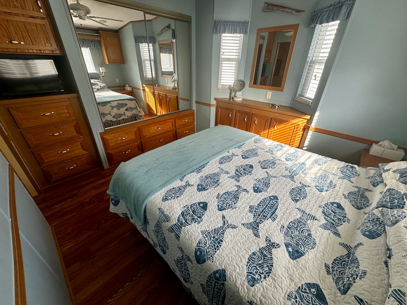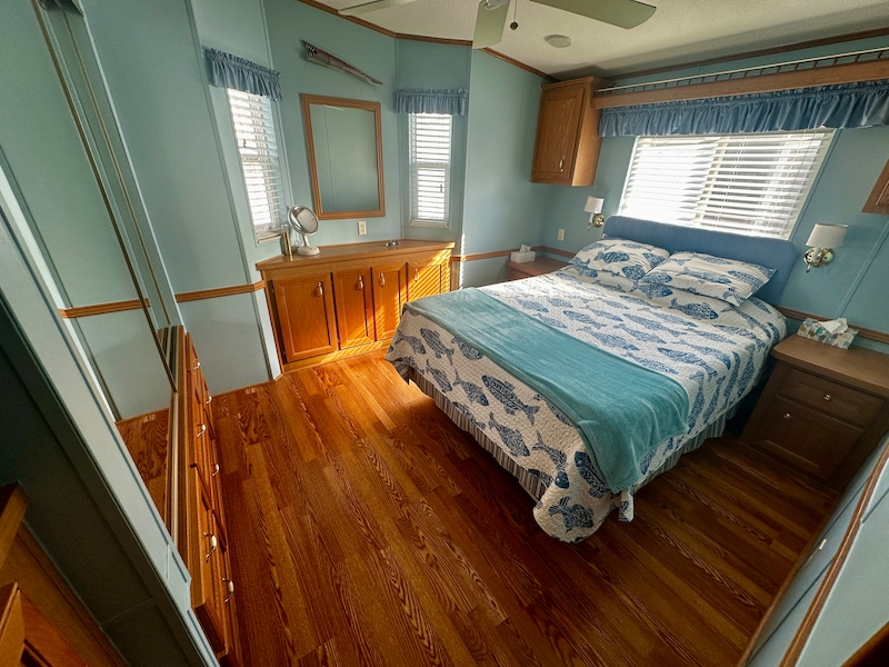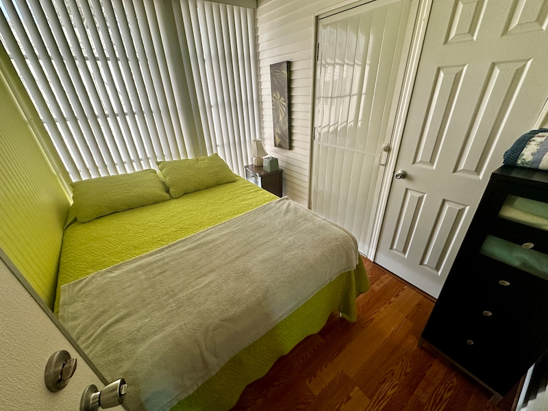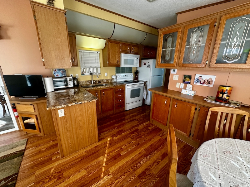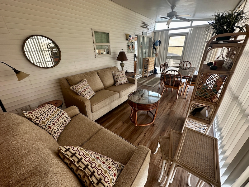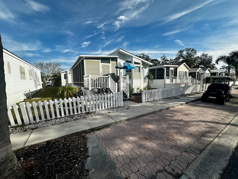 This charming 14'-wide West End home is nestled in the sought-after Live Oaks Picket Fence neighborhood. It features a raised lanai with an additional bedroom, providing extra space for family and guests. The lanai also includes a convenient half-bathroom, while the lanai shed offers extra storage for clothing or other essentials. Additionally, a separate storage shed at the back of the home is spacious enough to accommodate a golf cart. With brand-new flooring throughout, this home combines comfort and functionality. A must-see!Features