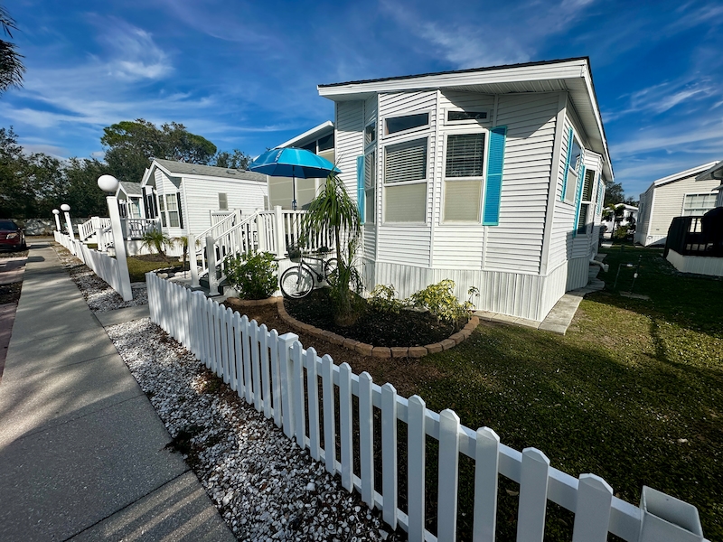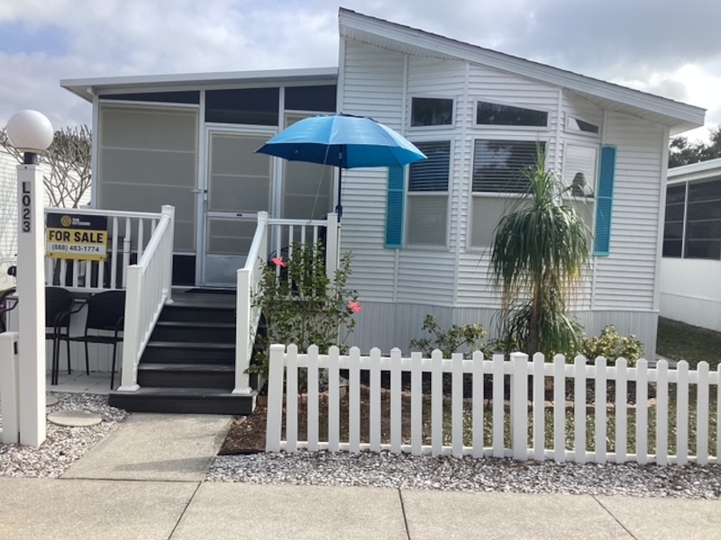 This charming 14'-wide West End home is nestled in the sought-after Live Oaks Picket Fence neighborhood. It features a raised lanai with an additional bedroom, providing extra space for family and guests. The lanai also includes a convenient half-bathroom, while the lanai shed offers extra storage for clothing or other essentials. Additionally, a separate storage shed at the back of the home is spacious enough to accommodate a golf cart. With brand-new flooring throughout, this home combines comfort and functionality. A must-see!Features