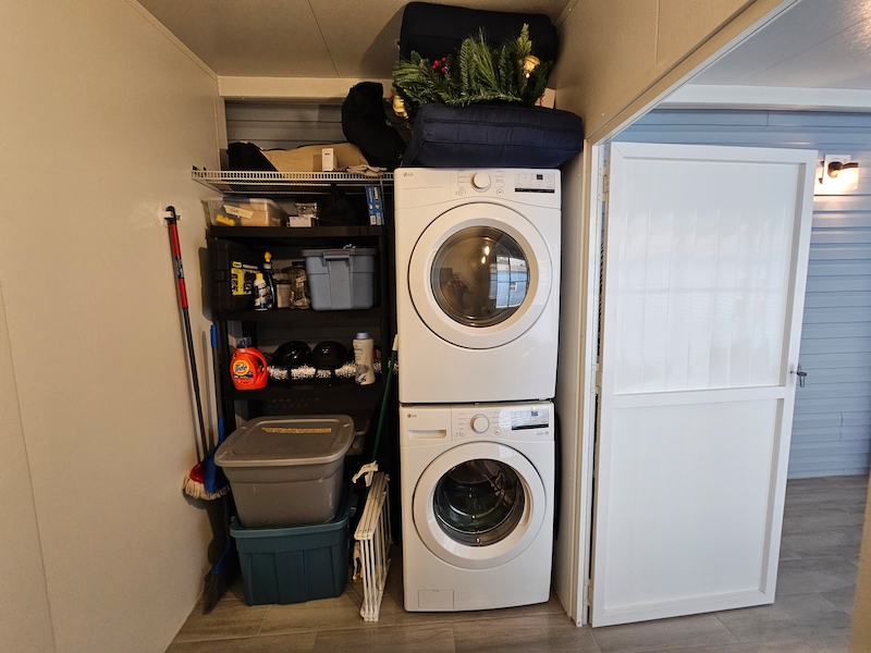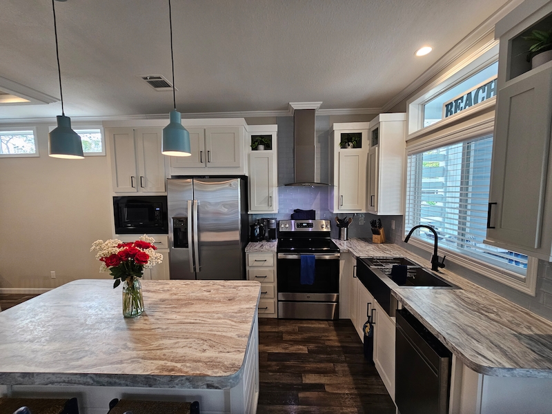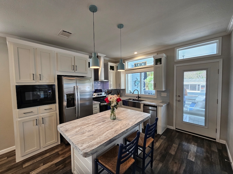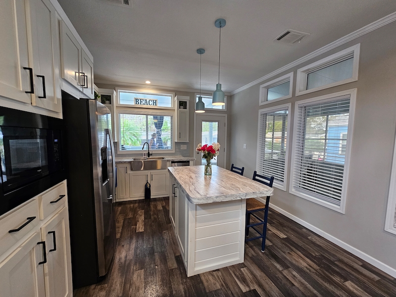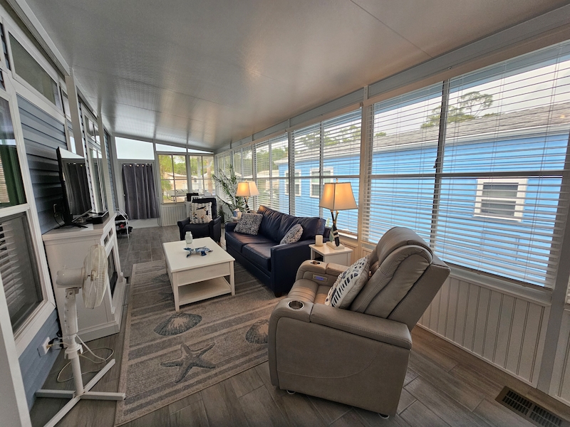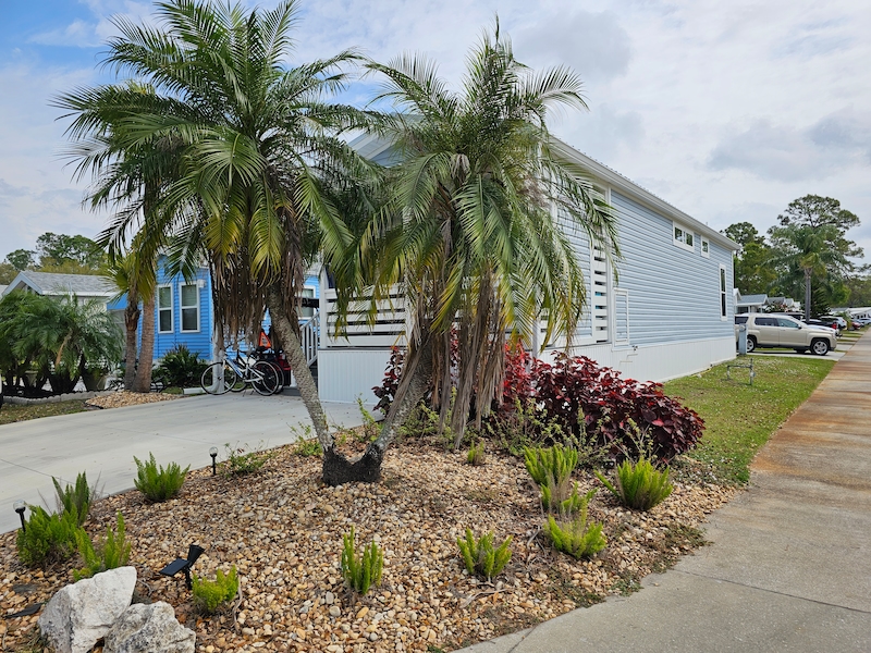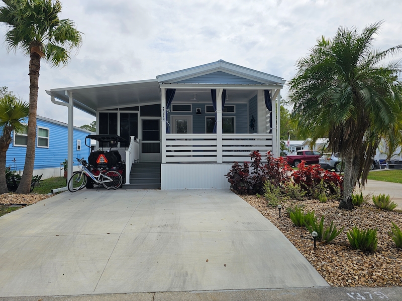 This stunning Lake Charles model is sure to impress! Enjoy relaxing evenings on the charming covered front porch, complete with an electric fireplace. Inside, the open floor plan features a front-facing kitchen with a spacious island, brand-new appliances, beautiful cabinetry, and a farmhouse sink. The primary bedroom easily fits a king-size bed, while the bathroom boasts a walk-in shower for added comfort. The extended lanai offers additional covered parking, blinds for privacy, insulation, and both heating and cooling. It also includes a washer and dryer, a convenient half bath. Don't miss out on this incredible home!Features