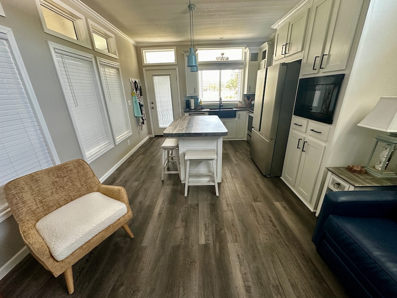 One-of-a-Kind Home in the Desirable West End – Fully Elevated for Flood Zone Compliance This unique Lake Charles model home is like NEW and beautifully maintained 1-bedroom, 1-bathroom home is fully raised to meet flood zone code requirements, offering peace of mind and added value. Enjoy outdoor living with both an open deck and a cozy covered porch, complete with an electric fireplace on a privacy wall—perfect for relaxing. Inside, you'll find a walk-in shower, a stylish farmhouse kitchen sink, stainless steel appliances, and a spacious island ideal for entertaining. The home also includes a washer and dryer conveniently located in the shed. Additional features include extra storage space built beneath the home and a 2023 Evolution lithium battery golf cart that comes with the property. This is must see property!Features
