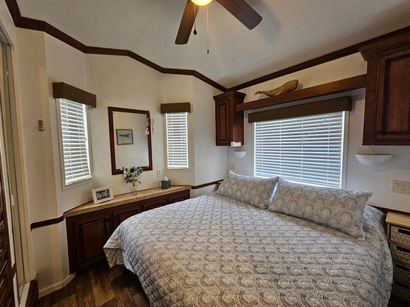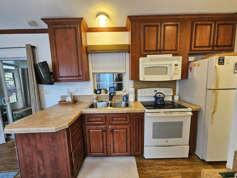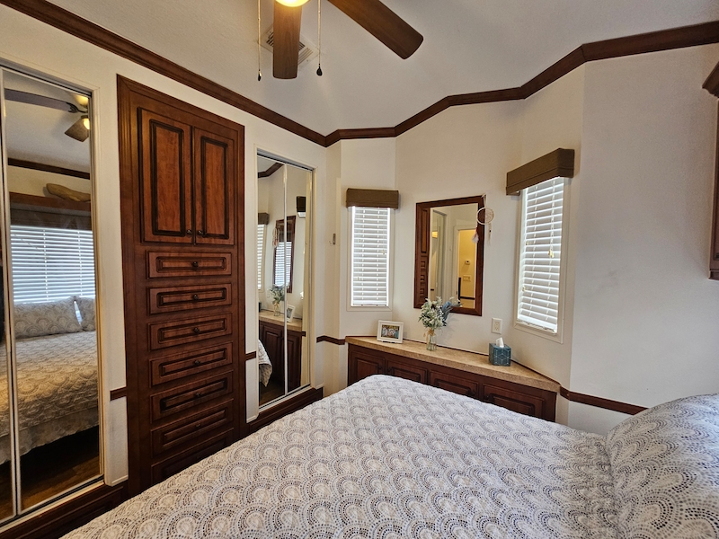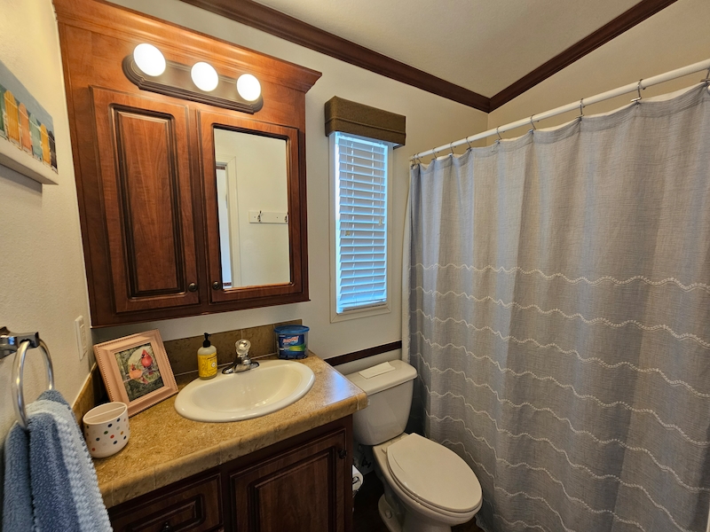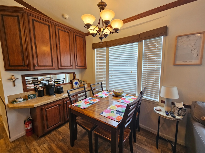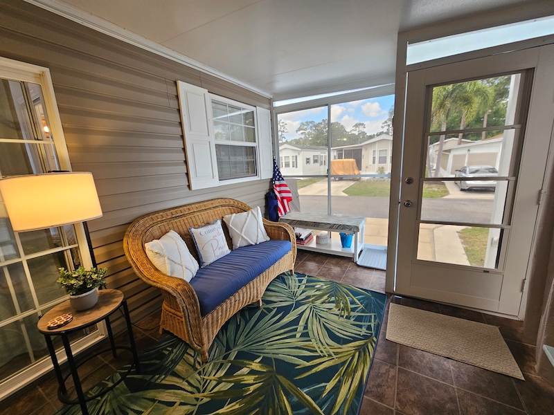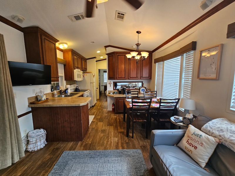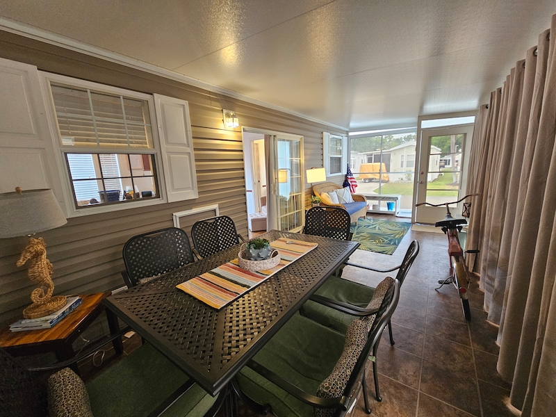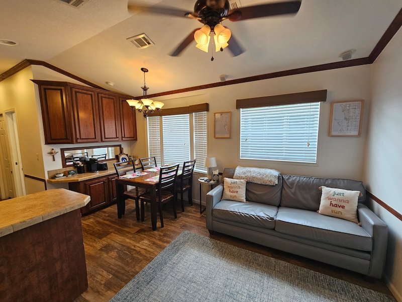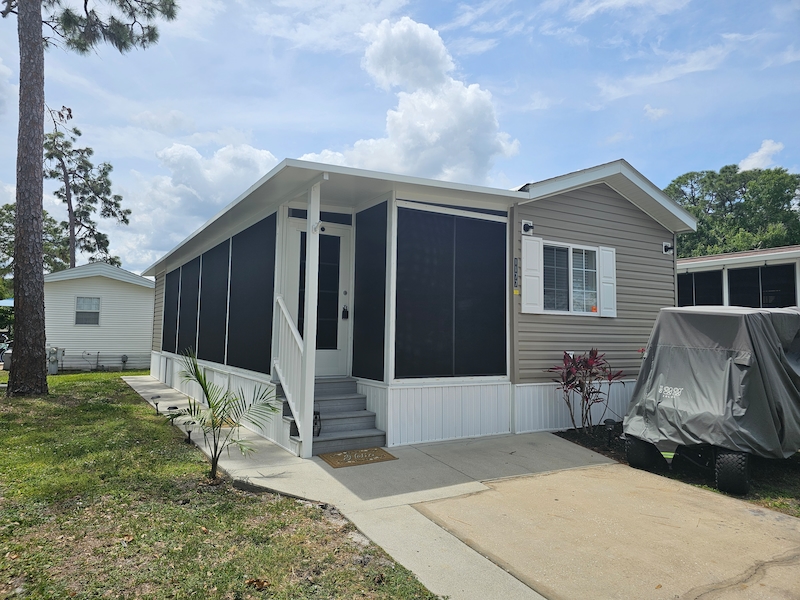Discover your dream home in the sought-after East End neighborhood of the resort! This beautifully updated 2014 mobile home offers 2 spacious bedrooms and 2 bathrooms, including a private ensuite in one bedroom and an added 3rd bedroom/bonus room. Recent upgrades enhance comfort and style throughout, including air conditioning to the lanai, new curtains and fresh paint in every room. Inside, you’ll find elegant cherry cabinets, beautifully textured walls, and thoughtful improvements like a newly added gates in the skirting for easy access. This home combines charm, functionality, and modern updates—ready for you to move in and enjoy!Features