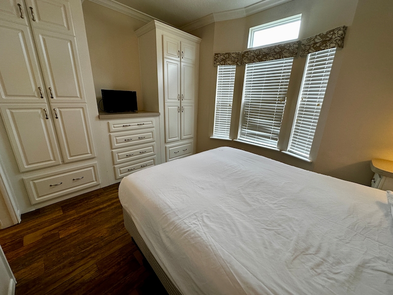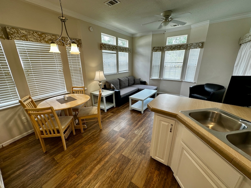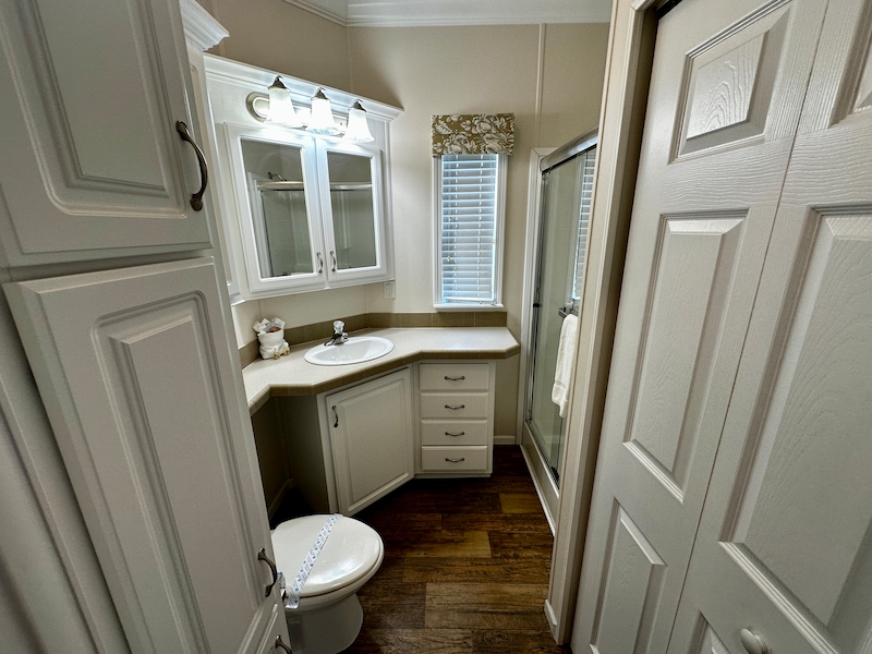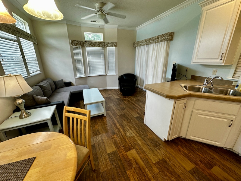 Step through the front door and into an open, light-filled living area that flows seamlessly into the kitchen. You'll immediately notice the crisp white cabinetry and matching white appliances, anchored by a dishwasher for extra convenience. The adjacent bathroom offers a bright, clean retreat, while the bedroom provides a cozy, private space. Additional practicality comes with washer and dryer hookups, making laundry day easy without sacrificing space. The home's central location places you just minutes away from the resort amenities — perfect for a quick stroll to the wellness center, the outdoor pool with bar and grill.Features
