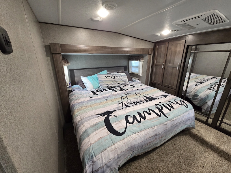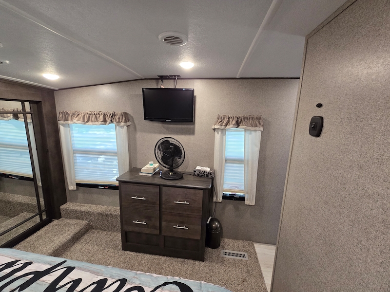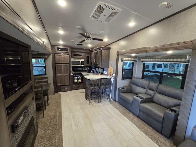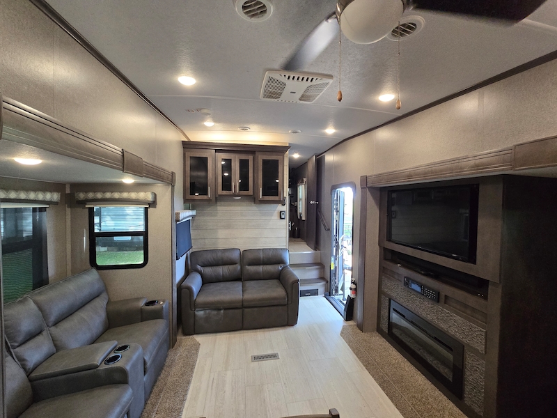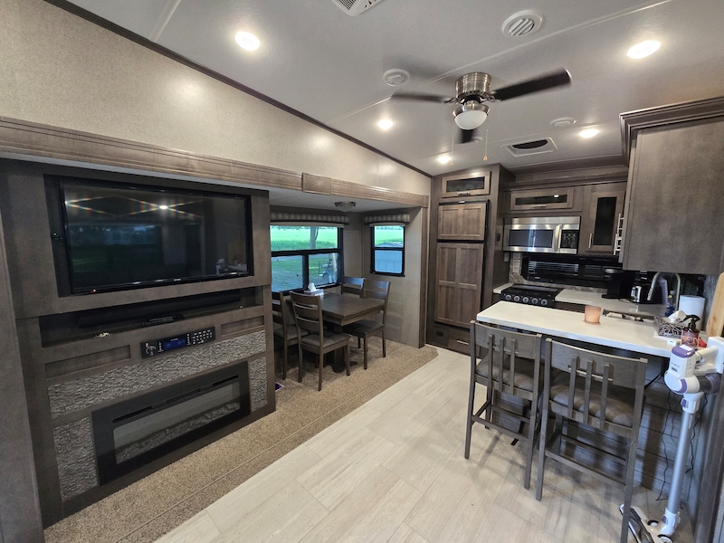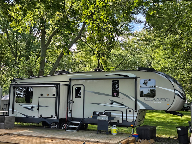 2021 Flagstaff Classic - $55,000 This like-new 5th wheel is located on the northwest side of the park. The rear kitchen with breakfast bar provides a fantastic workspace and lots of storge. The living area is spacious and is equipped with power reclining loveseat, large tv and electric fireplace. The bedroom has a queen bed and loads of storage. The included deck lets you relax with a great view of the surrounding fields and beautiful sunsets. Also included is the remainder of the 2025 season fees. Please call the office at 519-736-3201 if you’d like to schedule a viewing.Features