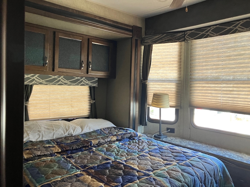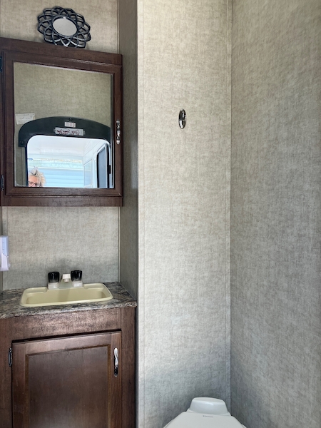 This absolutely gorgeous destination trailer features everything you and your family will need for a summer shore home! Sleeps 9- consisting of 1 queen, 1 set of bunks and 3 convertible/sofa beds. This unit provides quad slides for added interior space, a bunk room up front that the kids will absolutely love, and one and a half baths! Step inside and find a wide open kitchen and living area combined as you step through the sliding glass doors. The rear bunk room features a half bath with toilet and sink, plus entry to the outside. Also comes with attached sunroom for extra living space with gorgeous furnishings. As an added bonus, a like new golf cart is included in the price!Features