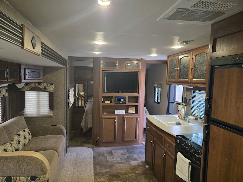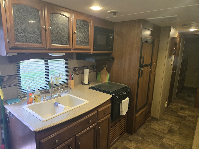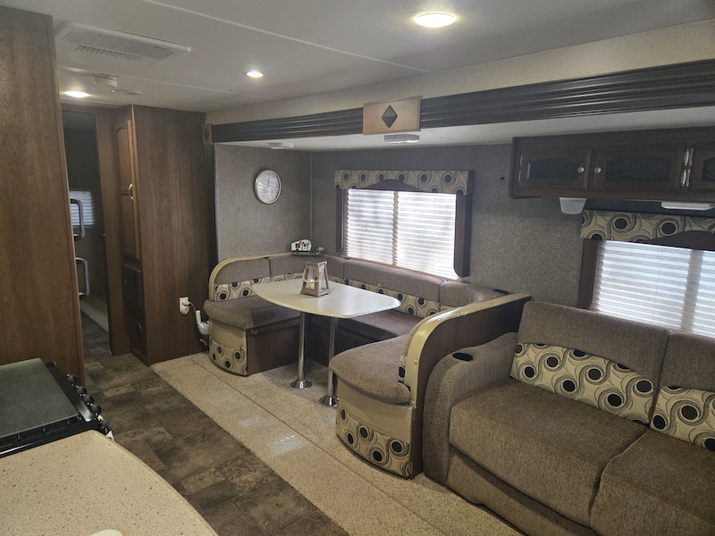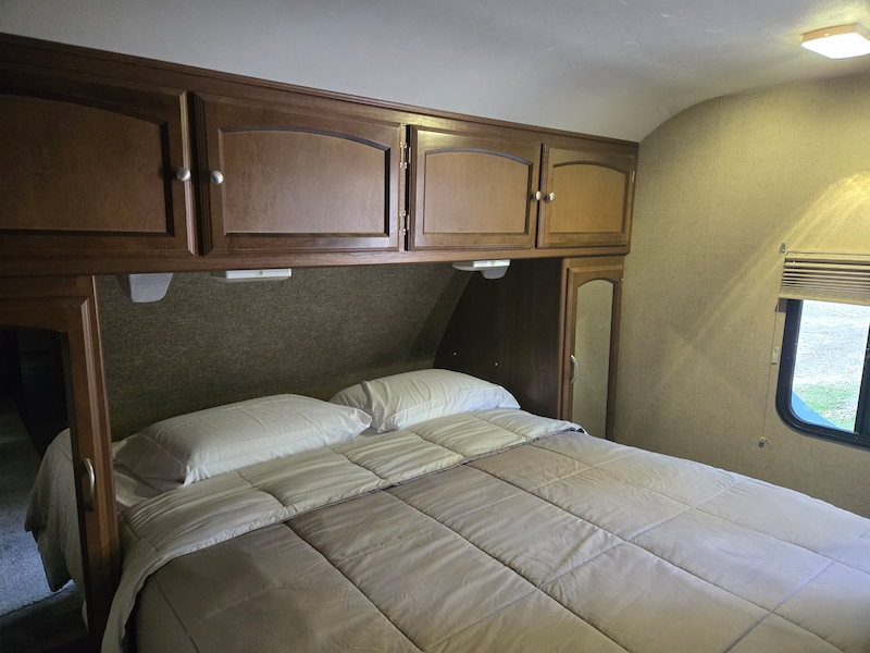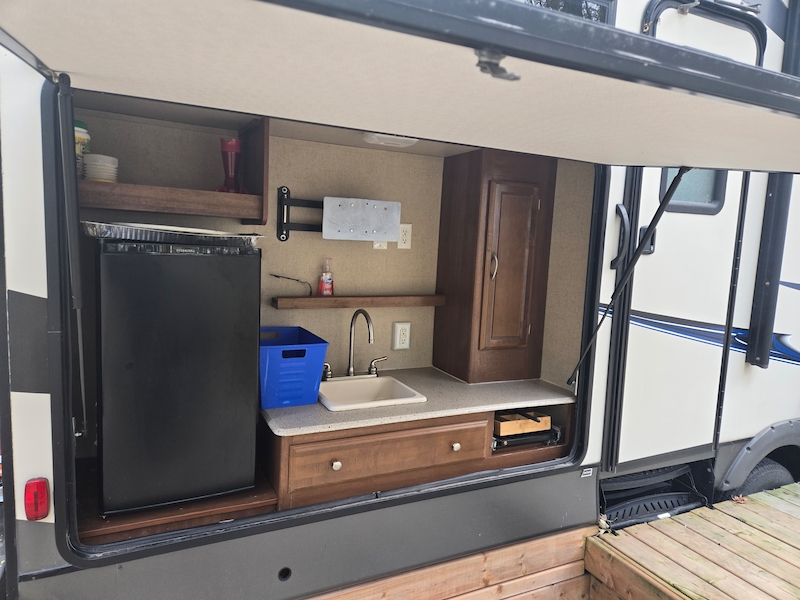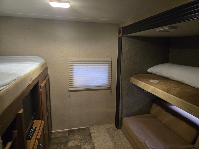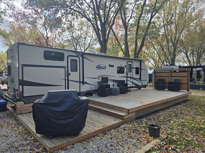2015 Freedom Express 310 - $26,500 This 2-bedroom, 1 bath trailer sits on a beautiful corner site on the west side of the park. The custom deck boasts lots of space for both family and entertaining. A queen bed in the primary bedroom and a bunk room in the back provide plenty of sleeping space. Lots of storage and functional space make this a great family retreat. Please call the office at 519-736-3201 if you’d like to schedule a viewing.Features