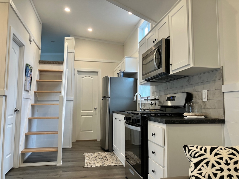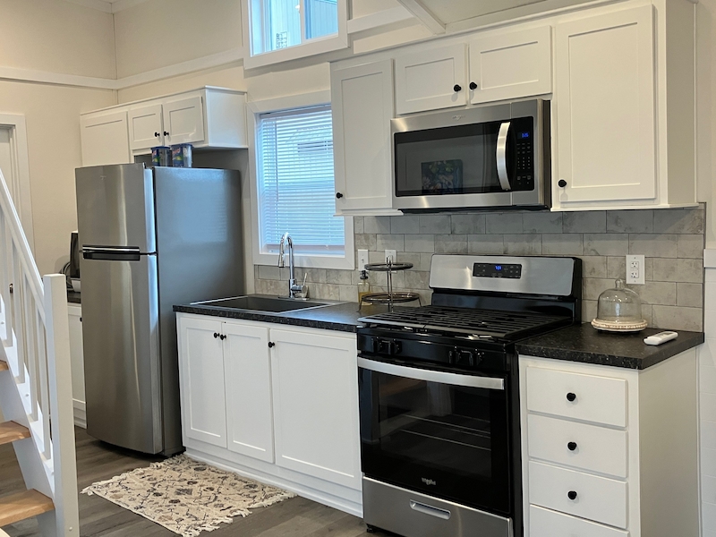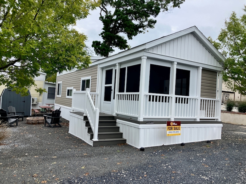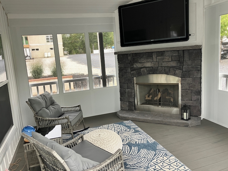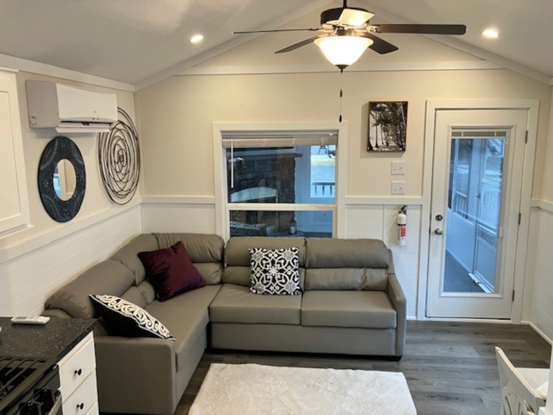 Two bedroom park models are HERE! This custom Shore Park by Skyline model includes a queen bed in the main a twin bunk combination for the second bedroom! And a loft area. Love an outdoor porch? Enjoy your propane fireplace right from your covered porch - A 55 inch outdoor television and weatherproof cover has been installed above the fireplace! Your site will be finished off with a shed and stone fire pit with 4 Adirondack chairs to enjoy.Features